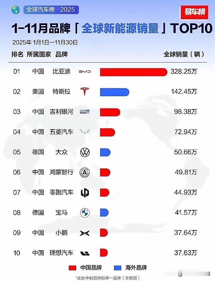 2025全球新能源杀疯了?中国7大品牌霸榜,比亚迪断层碾压! 1-11月的全
