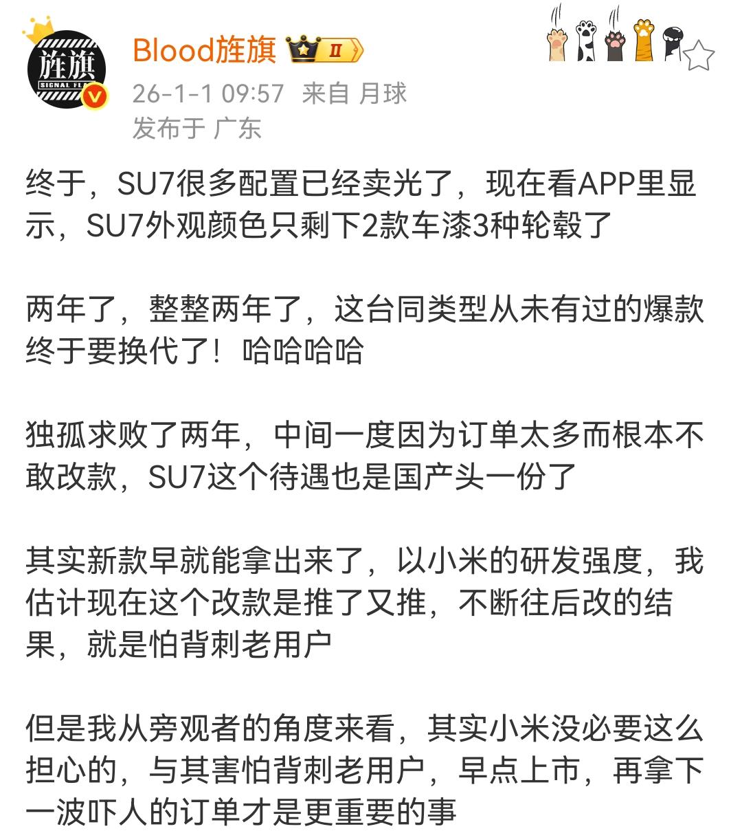 艹老师:小米SU7很多配置已经卖光了! 现在看APP里显示,SU7外观颜色只剩下2款车漆3种轮毂了,这也意味着这款车进入了产品末期,到了该换代的时候了。 这款车换代之后竞争能力肯定会大幅度的增加,首先最低配的车型肯定会用上激光雷达,其次整车的算力技术还会有继续的增加。在能耗表现方面,究竟有没有比较大的进步呢?这还需要等真正上市之后才知道。 小米SU7这款车长得好看,预计新款车型不会对外观进行大的调整,可能会用上新款的激光雷达,因为新款的激光雷达还是属于前年的产品。 各位是怎么看的?欢迎评论区留言。