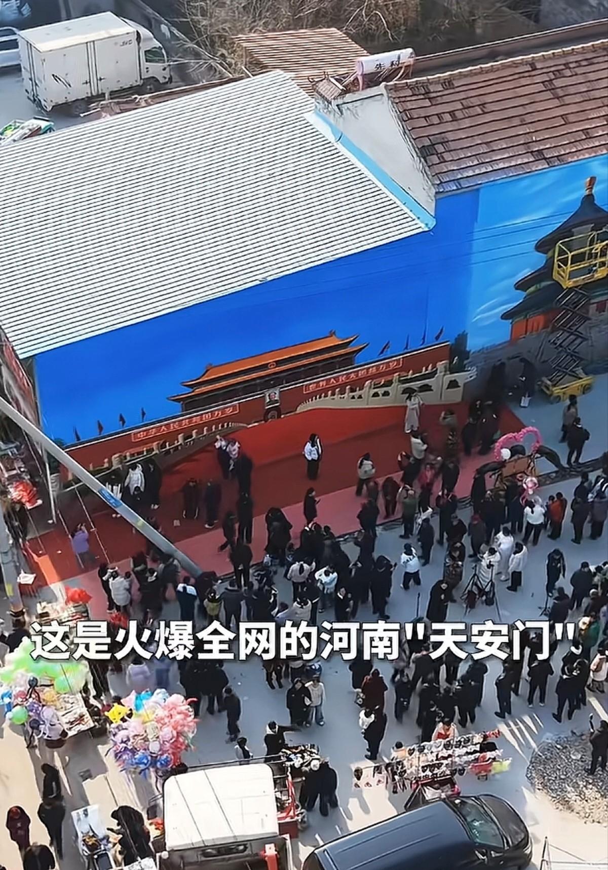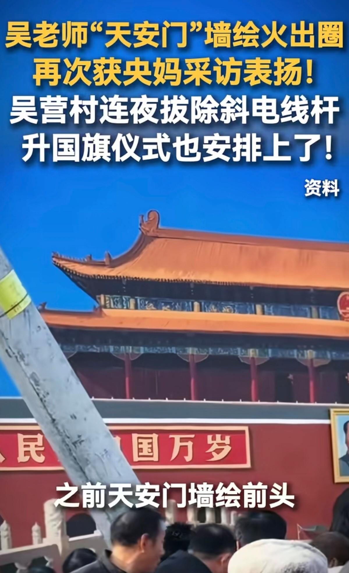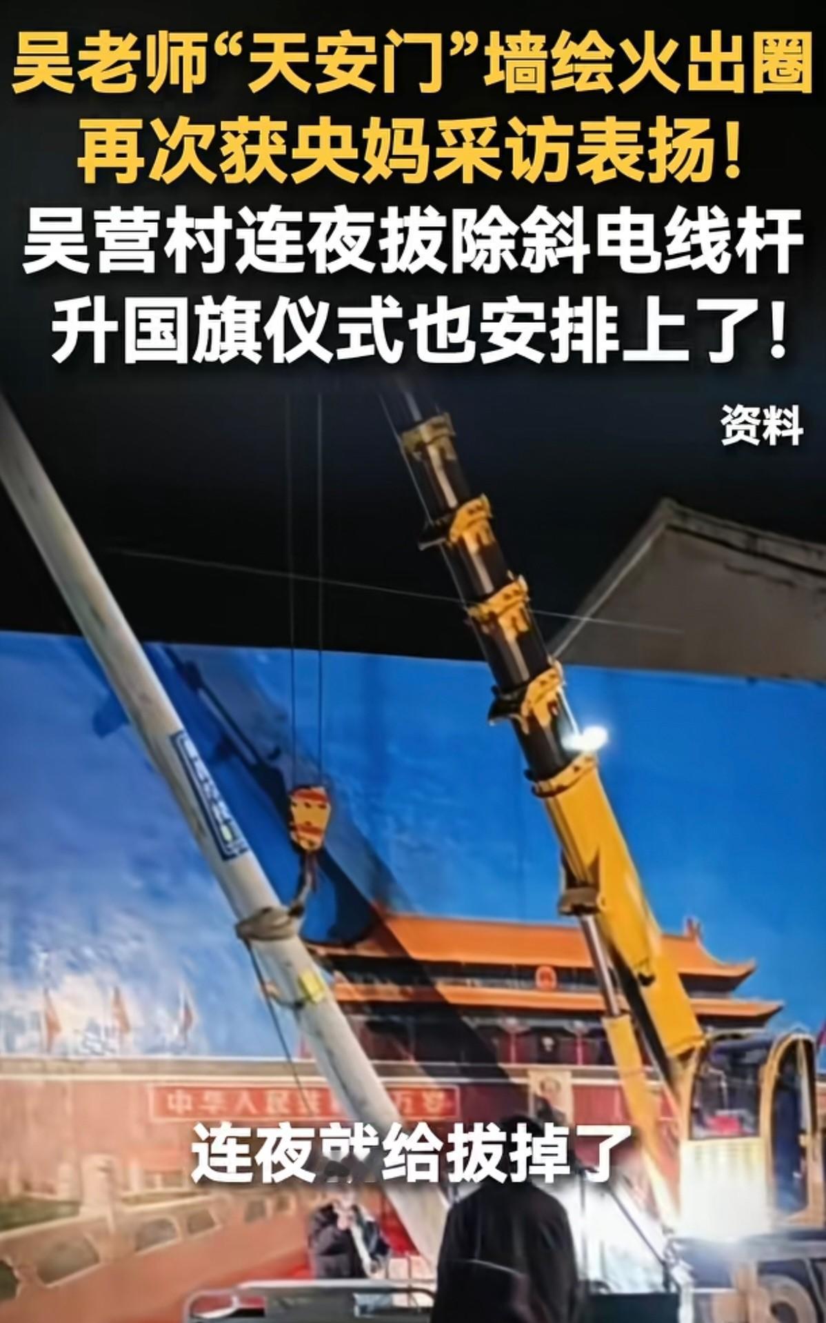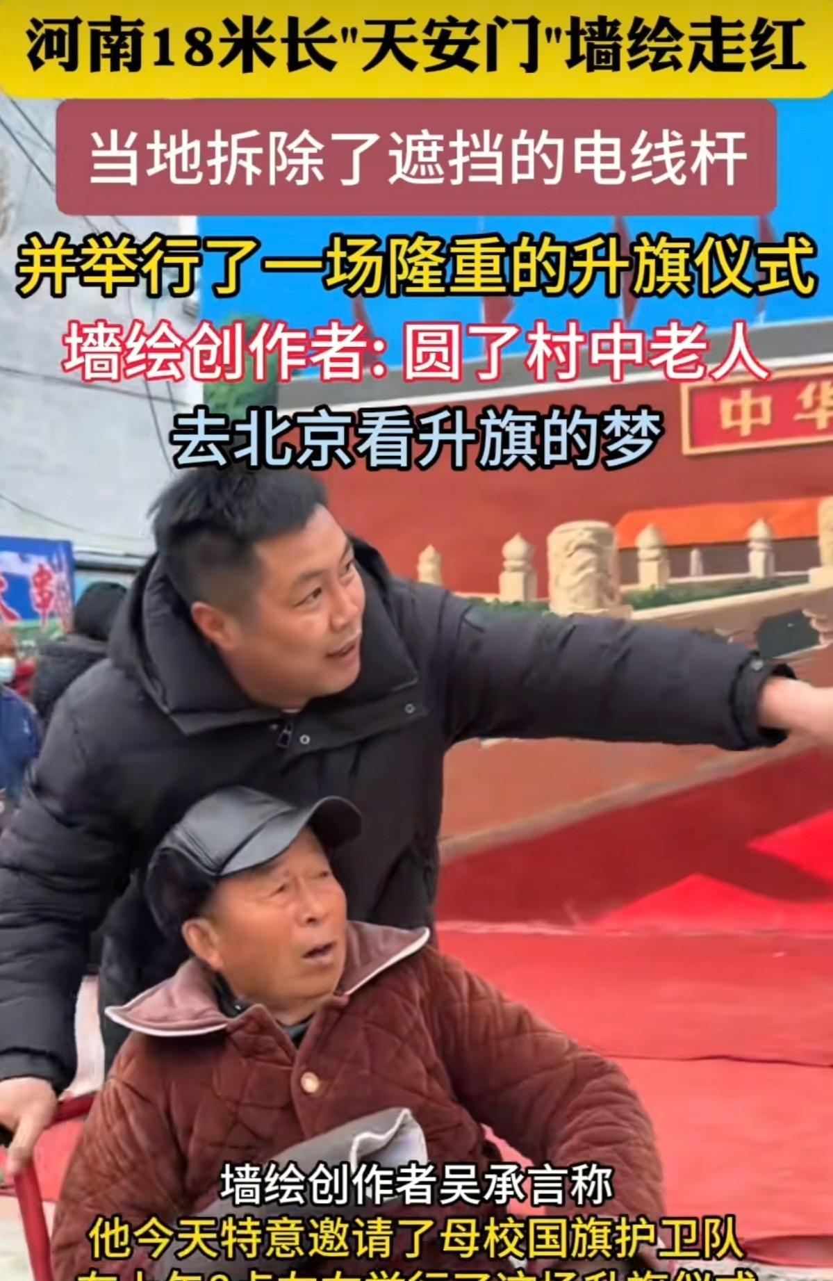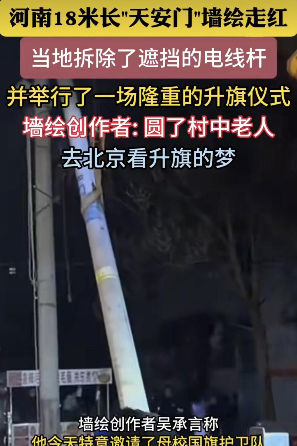 一幅墙画要配升旗吗? 12月27日,商丘吴营村火爆。长18米高8米的天安门墙画,吴承言耗时5天,12月23日完工,人民日报点赞。游客拍照总被前方电线杆挡,吐槽起。村里连夜叫来叉车,先断电,再把杆拔出,随后立旗杆。第二天8点升旗,8点3分开始,仪仗队是他母校学生。日均数万游客进村,村民摆摊多了钱,把进村主路修一新。平台封了一名一万人直播间的主播,疑因升旗未报备。网上两派,有人夸,有人说过了、还担心侵权。我的看法,活动可以搞,别太官样,保留朴实劲,更要守规矩。