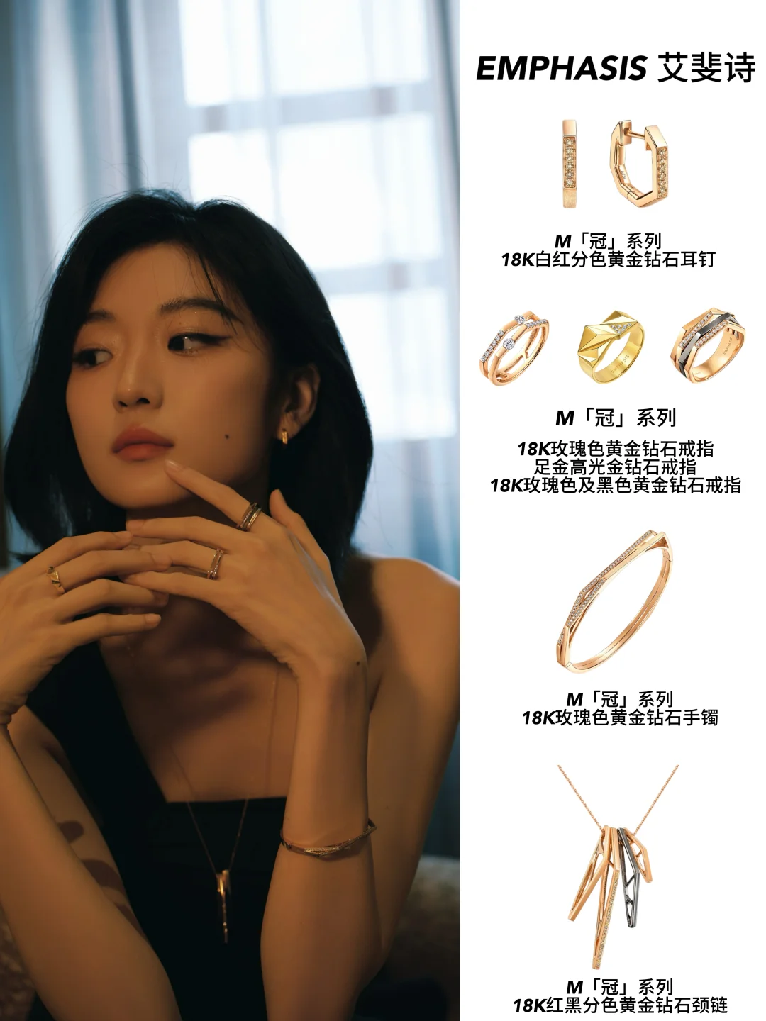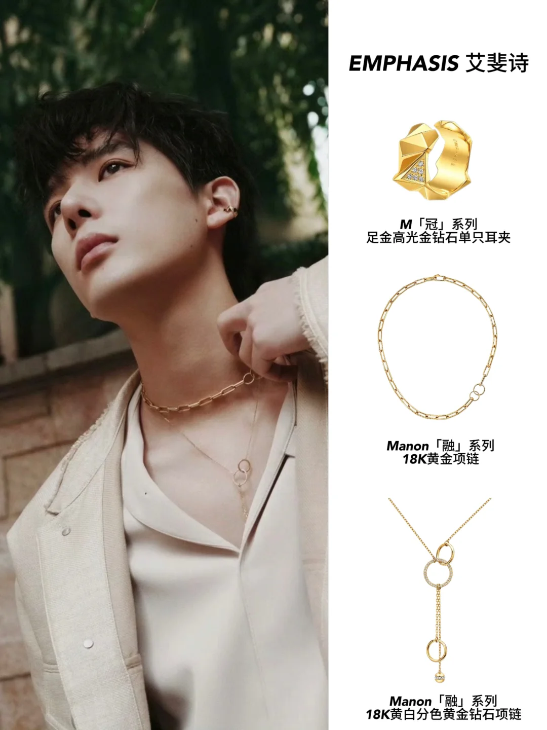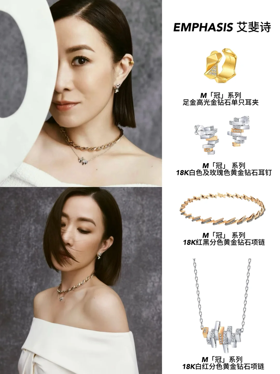 就说佘诗曼吧,私服里真的高频出镜EMPHASIS艾斐诗,设计完全抛开花里胡哨的潮流元素,只靠干净利落的线条和结构撑场面,妥妥的“长期主义”珠宝代表。
