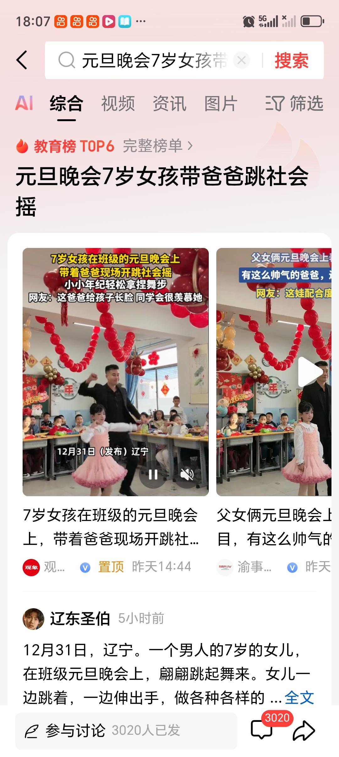 元旦晚会7岁女孩带爸爸跳社会摇 辽宁一小学元旦晚会上,7岁扎双马尾的小姑娘硬拉着老爸跳社会摇。小姑娘动作利索,小脸蛋乐开花,老爸却手脚像绑了沙袋,顺拐、踩错拍,逗得台下哄笑。其实老爸本不肯上台怕丢人,是闺女鼓励才每晚在家练。 视频上网后网友吵翻了天。有人觉得老爸可爱,放下身段陪玩是好的家庭教育;也有人反感,觉得爸爸存在感太强,抢了孩子风头。陪伴孩子成长是好事,但别让陪伴变了味,舞台终究是孩子的,家长适度参与就好。