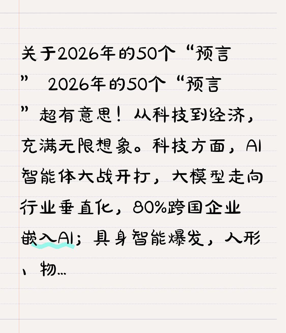 关于2026年的50个“预言” 2026年的50个“预言”超有意思!从科技到经济,充满无限想象。科技方面,AI智能体大战开打,大模型走向行业垂直化,80%跨国企业嵌入AI;具身智能爆发,人形、物流机器人批量落地,国内市场规模破万亿。6G完成系统级验证,量子通信全国组网。还有首个AI合成总统候选人可能出现,室温超导薄膜量产让电费降30%。经济等领域同样有不少大胆预测。这些虽基于趋势理性预判,但未来充满变数,不过也为我们提前布局和思考提供方向,一起期待这神秘的2026年!