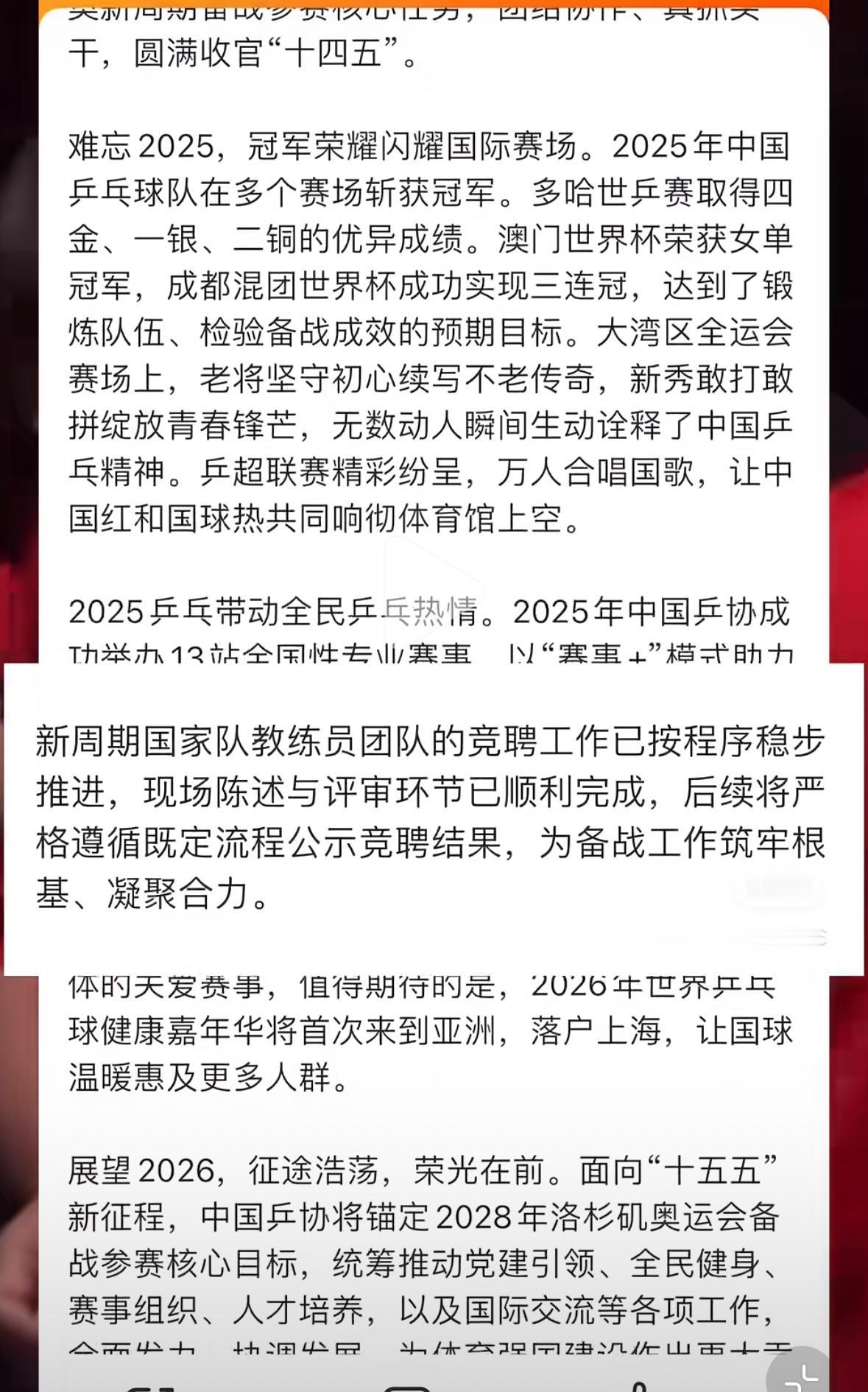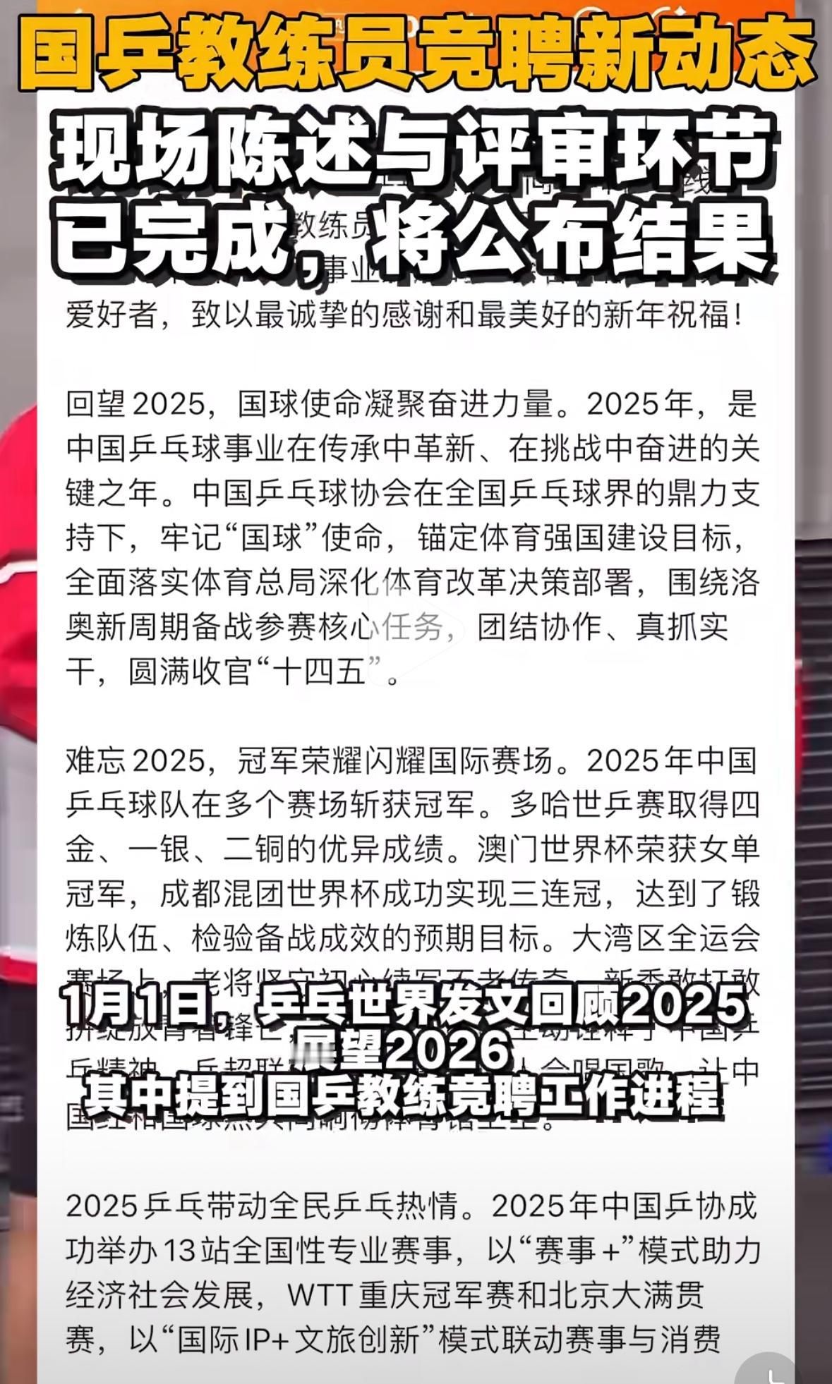 1月1日乒乓世界发文分享国乒教练竞聘新动态:现场陈述与评审环节已经结束,后续将进行公示环节! 乒乓世界回顾2025, 展望2026, 难忘2025,冠军荣耀闪耀国际赛场,展望2026,征途浩荡, 荣光在前,面向”十五五” 新征程,中国乒协将锚定2028 洛杉矶奥运会,备战参赛核心目标, 统筹推动党建引领, 全民健身,以及国际交流, 为体育强国作出贡献! 预测一下吧, 秦总,肖副总, 王继续男队总教练, 马继续女队总教练! 孙逊带王楚钦, 邱贻可继续带莎莎, 任皓带曼昱, 志强带梁靖崑和林诗栋! 教练分配还需要磨合, 26年是磨合期, 不出成绩还可以调配, 一两次比赛看不出什么, 主要是2027年的冲刺年, 大家放平心态, 坚决支持和相信国家乒乓球队……