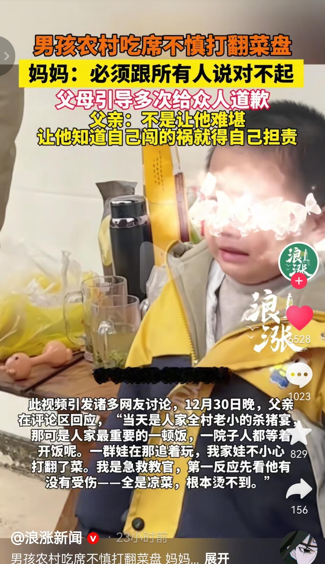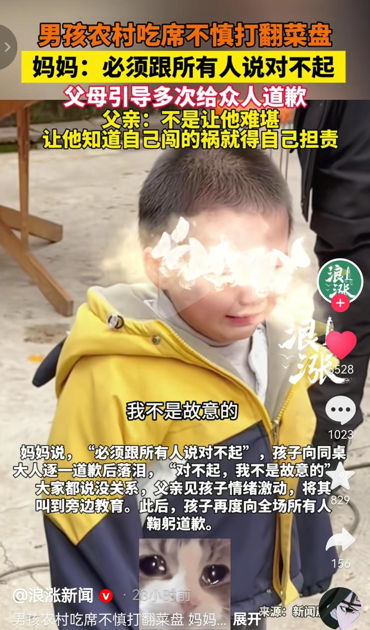 12月29日,四川雅安,在一场热热闹闹的杀猪宴上,一个小男孩跟着同伴追逐打闹,没留神撞翻了桌上的菜盘。 满桌的菜就这样撒了一地,周围人都看了过来,本以为家长会笑着打圆场,说句“孩子小不懂事”就过去了,没想到孩子的妈妈竟然这样做。 只见男孩的妈妈快步走过来,没骂也没打,却板着脸跟孩子说:“这不是咱们自己的家,闯了祸就得认,必须跟在场所有人说对不起。” 孩子瘪着嘴,红着眼眶,挨个儿给同桌的大人鞠躬道歉,嘴里小声念叨着“对不起,我不是故意的”。 众人都摆摆手说没关系,可男孩的父亲还是把他叫到一边,又耐心叮嘱了几句。没过一会儿,孩子再次走到院子中央,对着全场的人深深鞠了一躬。 这段视频传到网上后,有人议论,觉得这对父母太较真了,当着这么多人的面让孩子落泪,未免太苛刻。 而男孩的父亲,解释清楚事情的来龙去脉,大家才彻底懂了这家人的用心。 他说,当天的杀猪宴是主人家一年到头最重要的饭局,全村老小都聚在一起等着开席。 他自己是急救教官,孩子打翻菜盘后,他第一时间先检查孩子有没有受伤——还好打翻的都是凉菜,没烫到孩子。 紧接着,他当场掏出一千块钱要赔偿,主人家说啥也没收。夫妻俩过意不去,转头又买了几十斤猪肉送过去,还留下来帮着收拾了大半天。 “让他认错,不是为了让他难堪,就是想让他从小记住,自己闯的祸,就得自己担责。 网友看到后评论说:“这才是真的为孩子好!现在太多家长只会护短,教出来的孩子没规矩,这对父母太拎得清了!” 还有的网友说: 一开始我也觉得父母有点苛刻,看完爸爸的回应才懂,不是让孩子难堪,是让他知道犯错要付出代价,这教育方式真高明。” 其实,这种场景很常见,比如孩子在商店打碎东西,家长赶紧拉着孩子溜之大吉。可是,大家忘了,真正的爱,从来不是无底线的纵容。就像这个家庭,父母看似用“严厉”的方式,让孩子学会了尊重他人、扛起责任,这份教育,比给孩子买多少昂贵玩具、报多少补习班都管用。 家教从来不是挂在嘴边的口号,而是藏在生活里的每一个细节,藏在孩子每一次犯错后的引导里。 这个小男孩今天流下的所有委屈与眼泪,终会变成他日立身社会的底气。毕竟,一个从小就懂得为自己行为负责的孩子,未来走到哪里,都不会差。 大家觉得呢?欢迎大家评论区讨论留言。