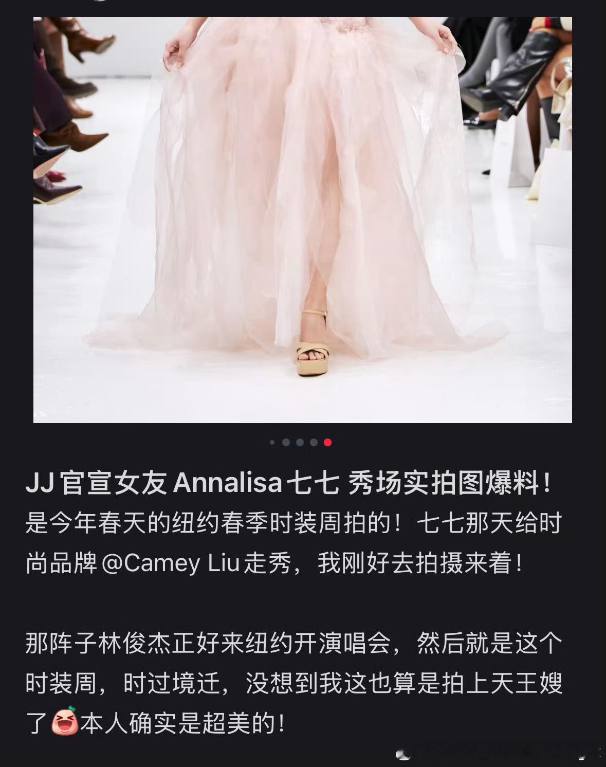 有摄影师晒出林俊杰新女友七七走秀图,称是今年纽约时装周时偶遇七七给时尚品牌走秀,刚好那阵子林俊杰来纽约开演唱会,看来一切恋情早有痕迹