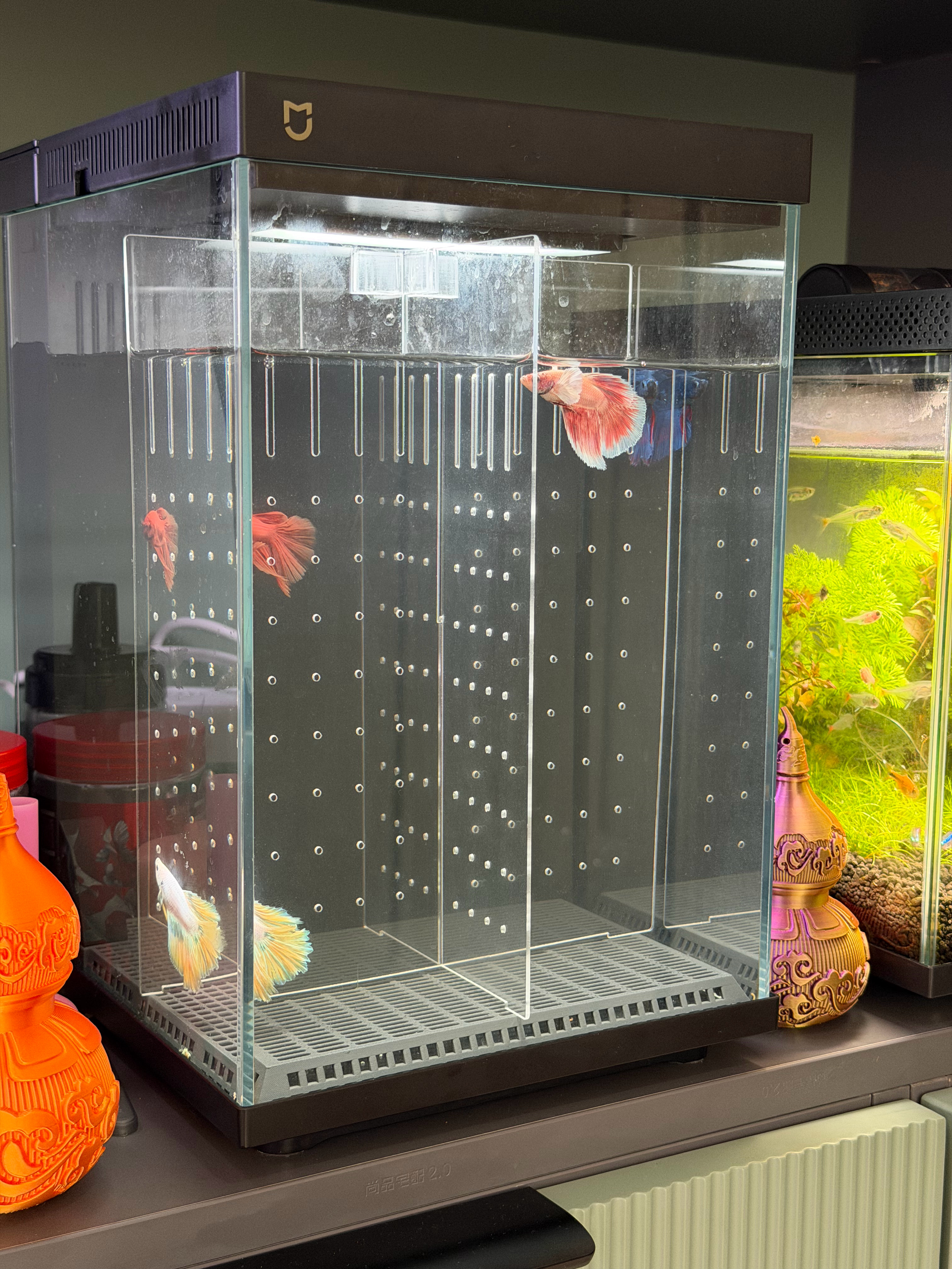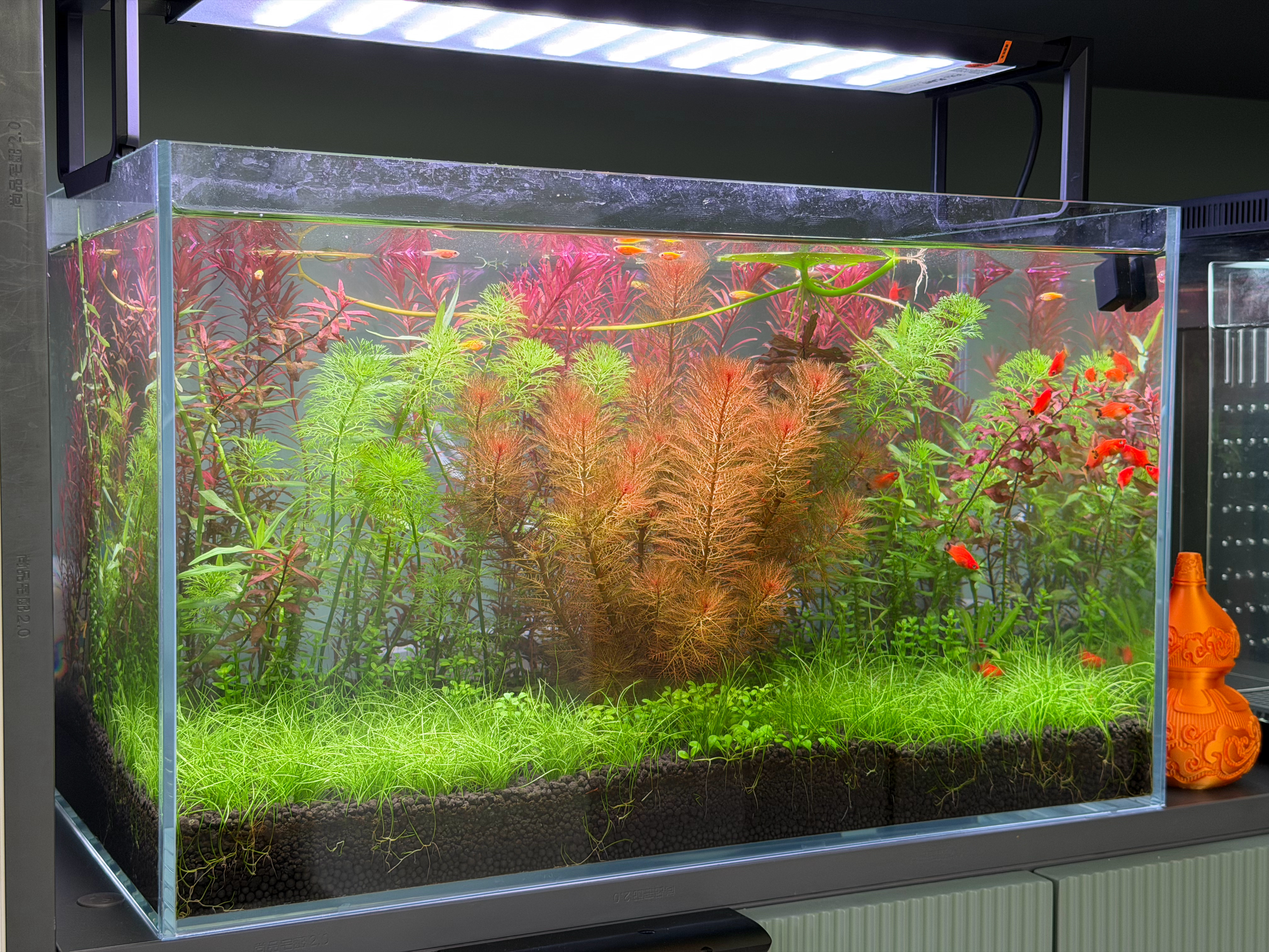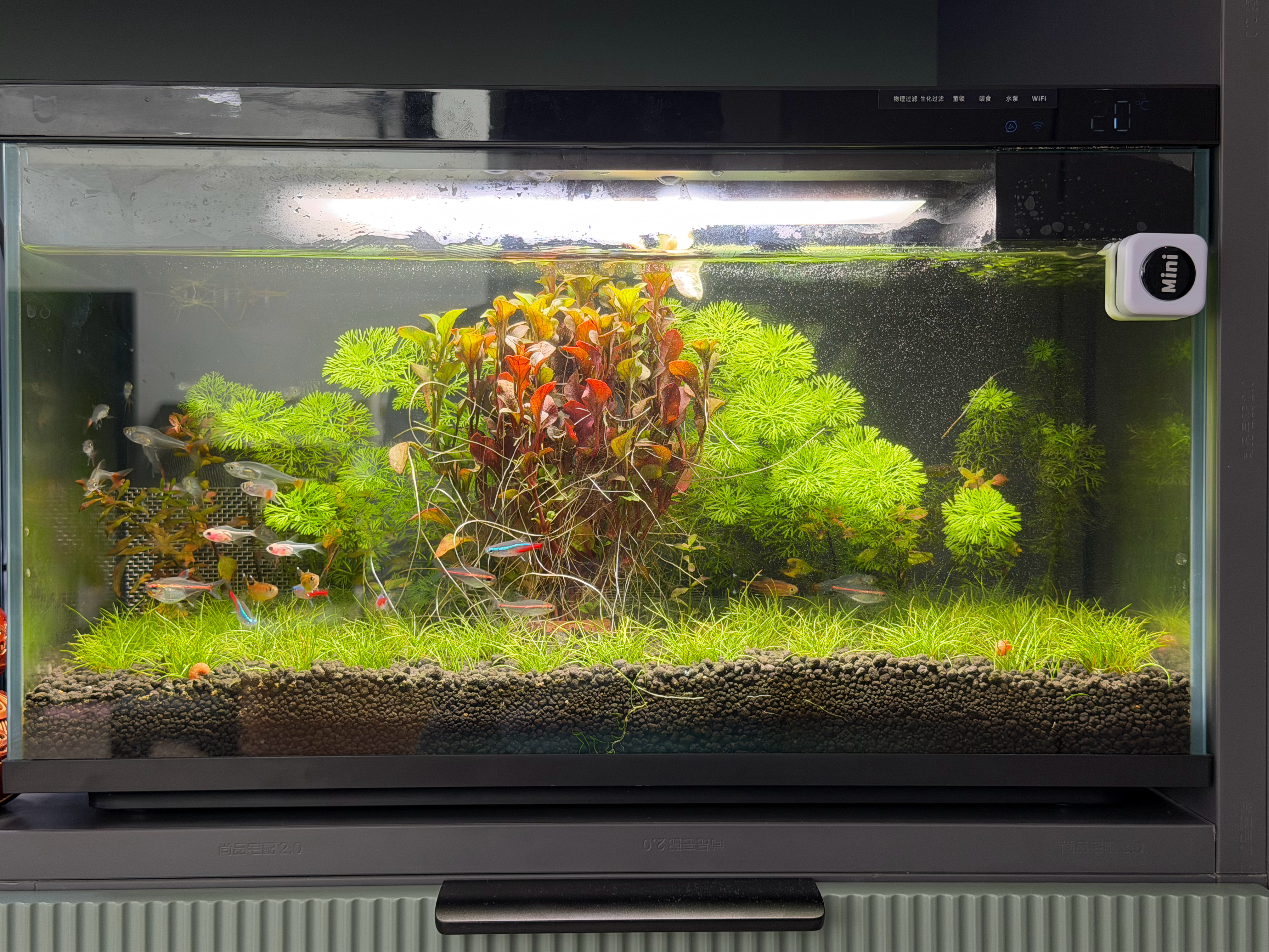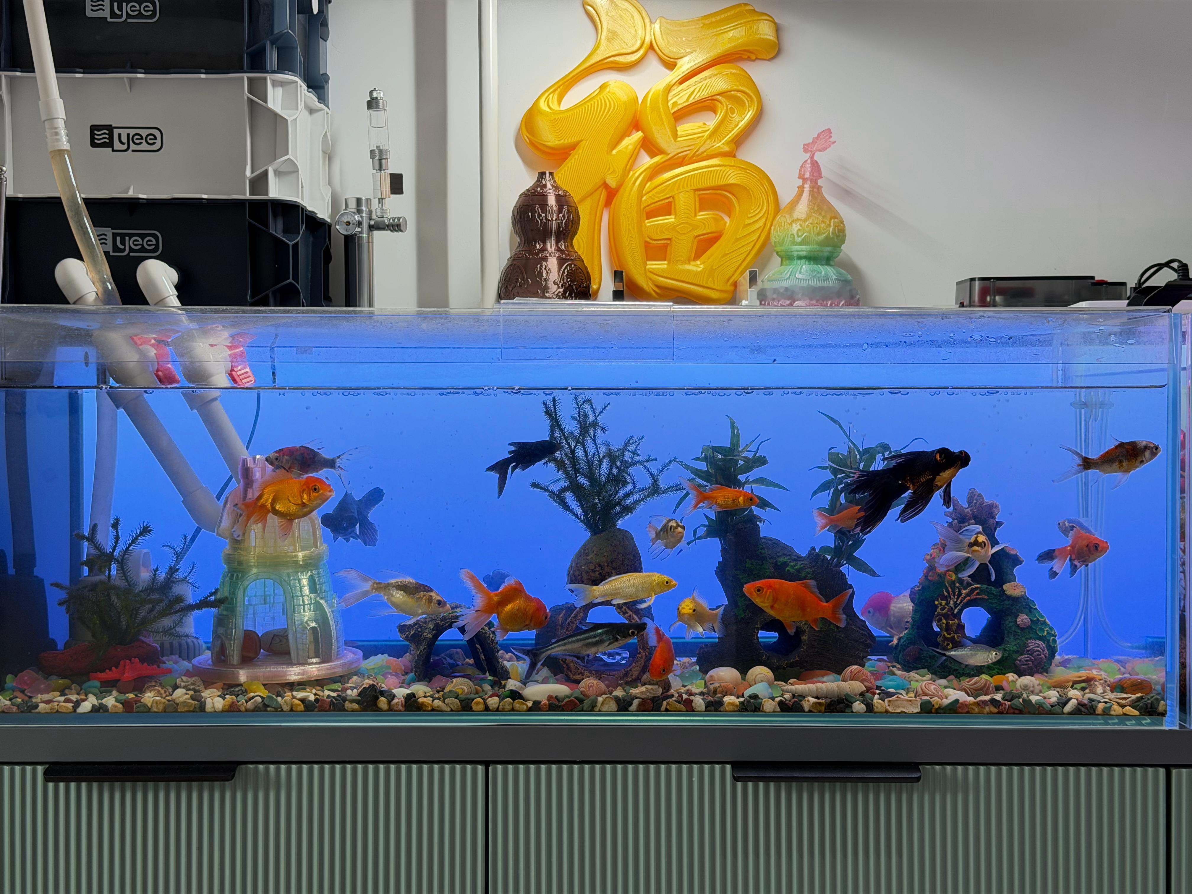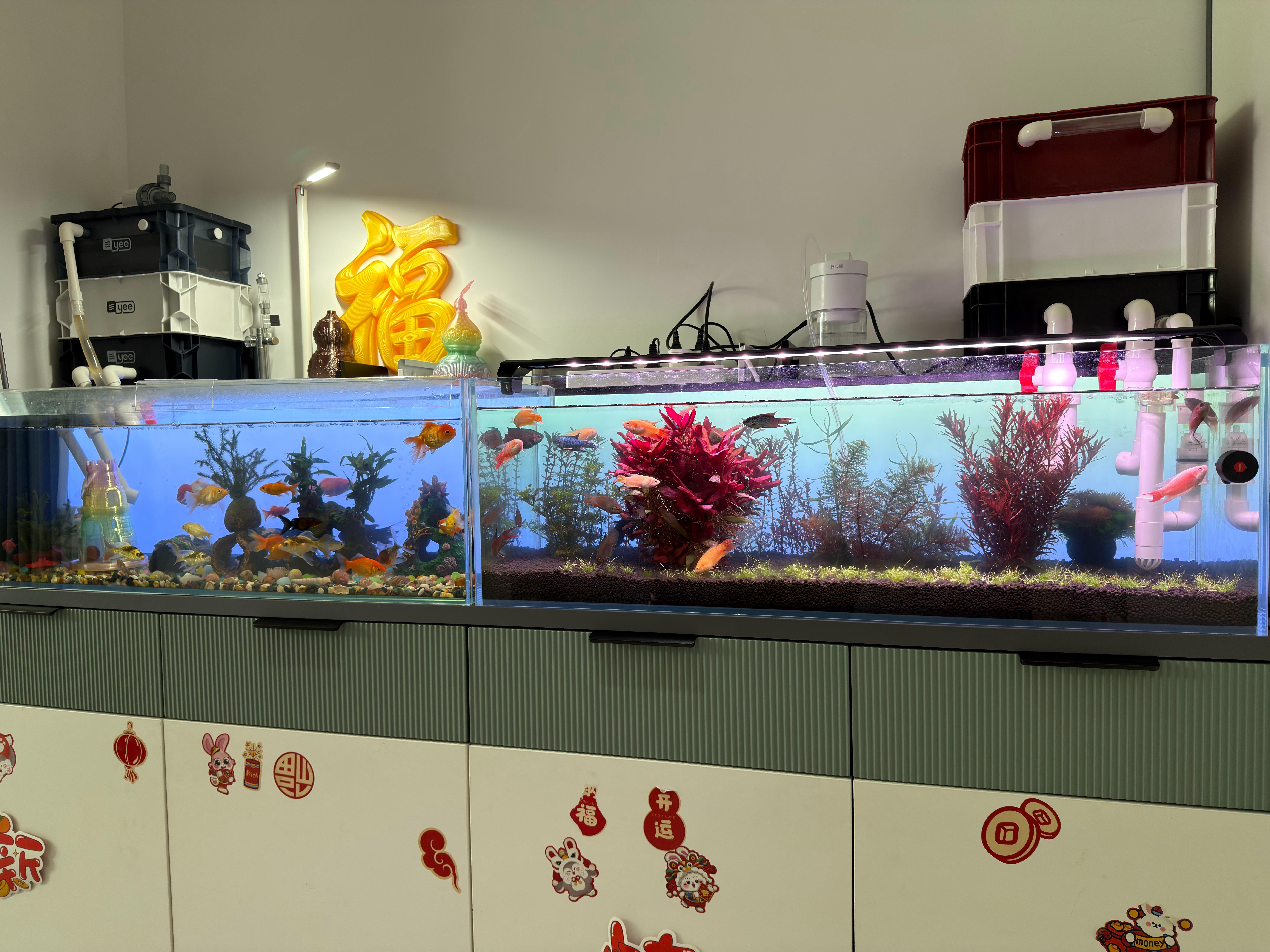 从小米鱼缸开始的养鱼入坑过程,现在有5个鱼缸,鱼缸还得大,小的养不开。老三可能是看不清小鱼,喜欢看大鱼,所以最近陆续入了两个1米大缸……孩子喜欢的东西,预算审批就是快