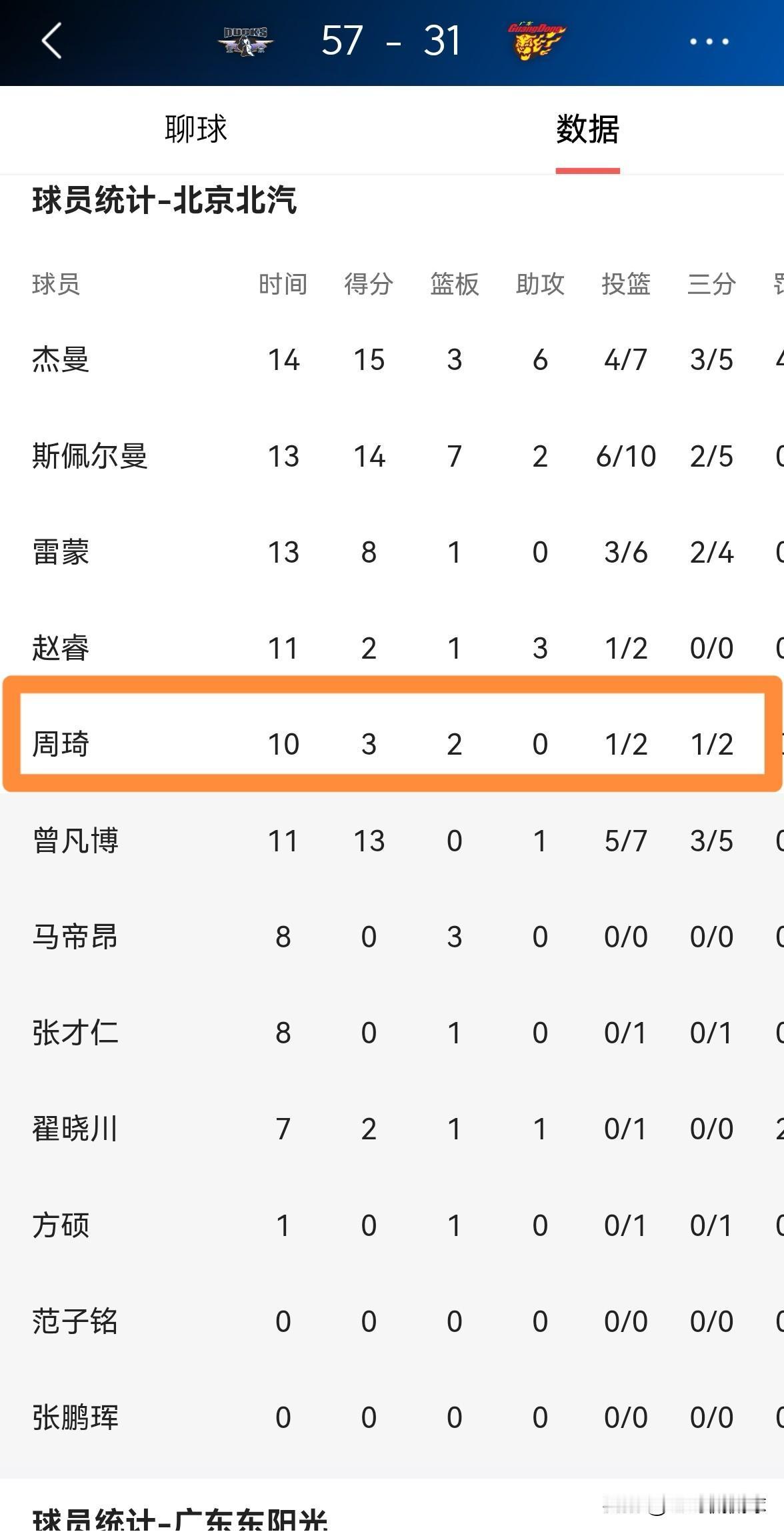 北京北汽超级中锋周琦真是太有良心了!在今天北京北汽主场迎战广东东阳光的比赛中,目前双方的上半场比赛已经结束,北京北汽以57:31领先对手。此役面对旧主,周琦在攻防两端并没有用尽全力,他在首发出战的10分钟里,仅仅出手2次得到3分2篮板,他的场上正负值为+12。 从周琦在上半场比赛中的表现来看,他还算是有良心,毕竟广东东阳光曾经对周琦不薄。