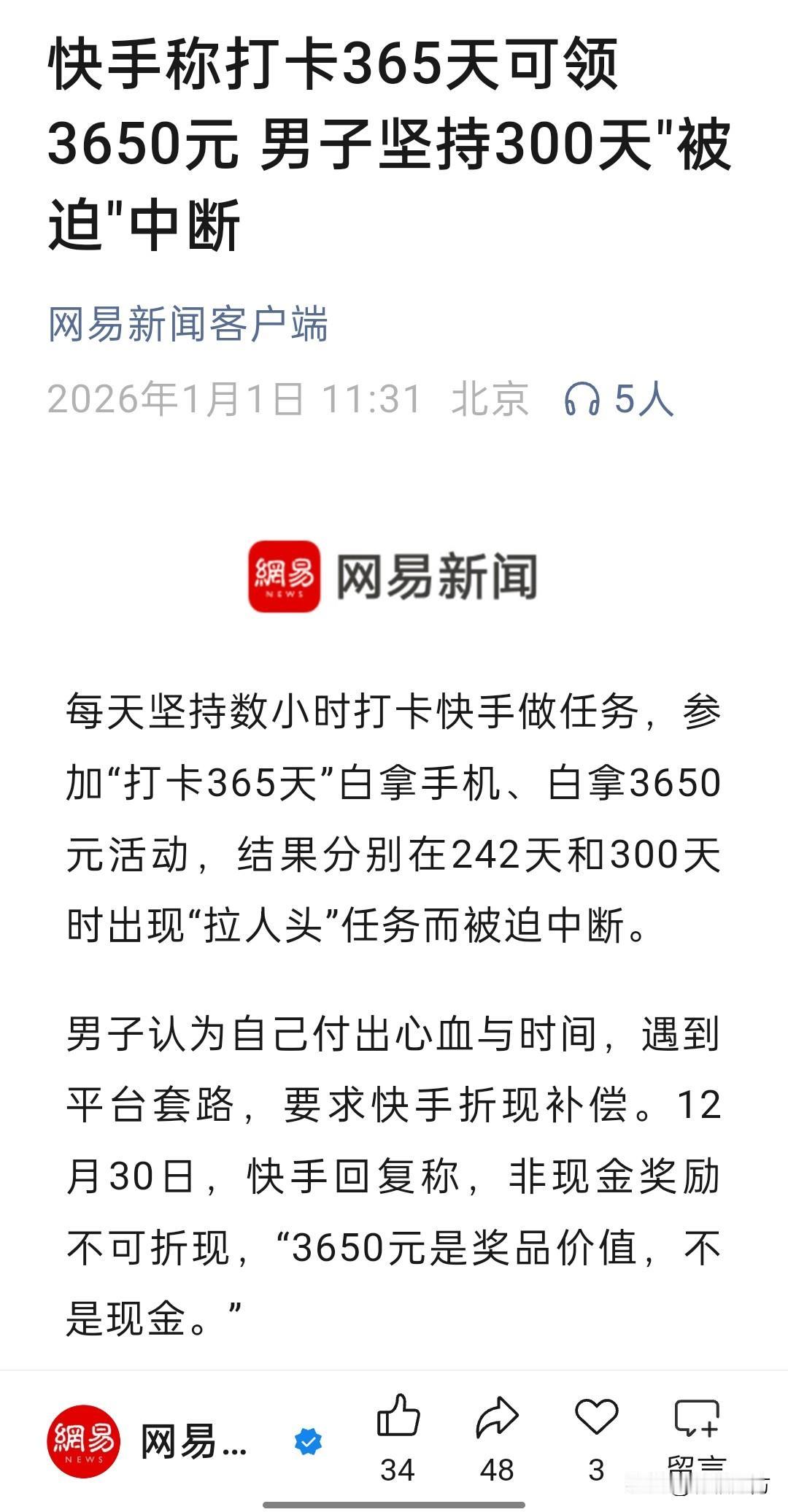 一网友参与快手连续打卡领奖活动,坚持300天后,因为需要“拉人头”任务无法完成而被迫放弃。 这事儿也不能说快手有什么错处,但确实很有套路感,一般人应该不会去参与跨时这么久的打卡活动,不幸碰上套路也通常是自认倒霉,这位大哥能坚持 300天,任务中断了还要平台补偿,可见是个认真的人,但认真也要看对什么人什么事,碰上了网络流氓就很难有好的结果。 林子大了什么鸟都有,有的企业靠诚信取胜,有的企业却能靠套路取胜,而且只要胜了就可以“英雄不问来路”。[捂脸]作为普通消费者,我们可以骂一句“玩不起就不要玩”,但同时也可以少些轻信,不和他们玩,离那些总玩套路的垃圾尽量远一些。[笑哭]