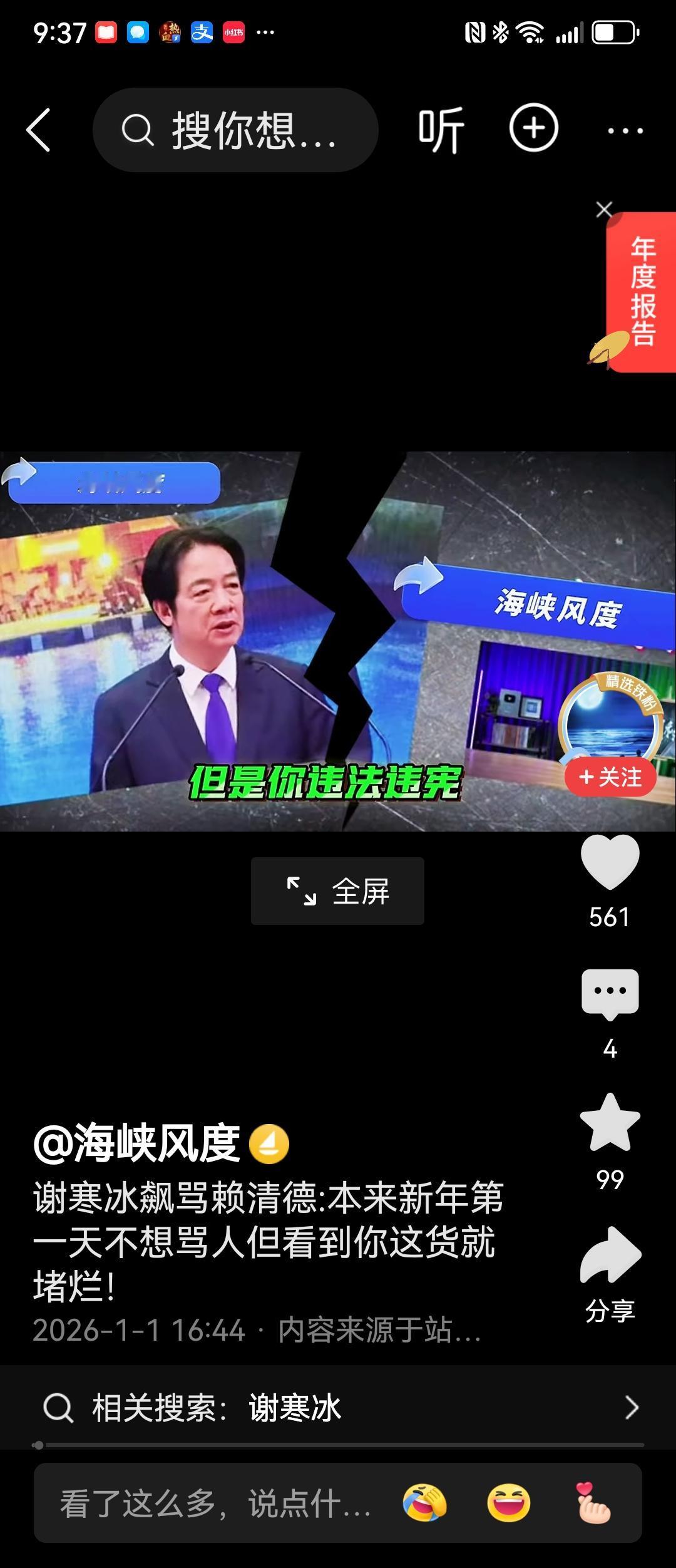 谢寒冰那个恨哪快要冲出屏幕了,恨赖清德违宪乱政,正事不做,整天为自已的权欲搞内斗;恨青鸟和被青鸟蒙骗的民众无智无脑,自欺欺人,什么AI了,什么幻觉了,什么没实力了,什么不更敢登岛了,枪都顶在脑门上了还闭眼自嗨。明白人有时也是很痛苦的,而台岛真正的痛苦在于谢之两恨看去一时难消。