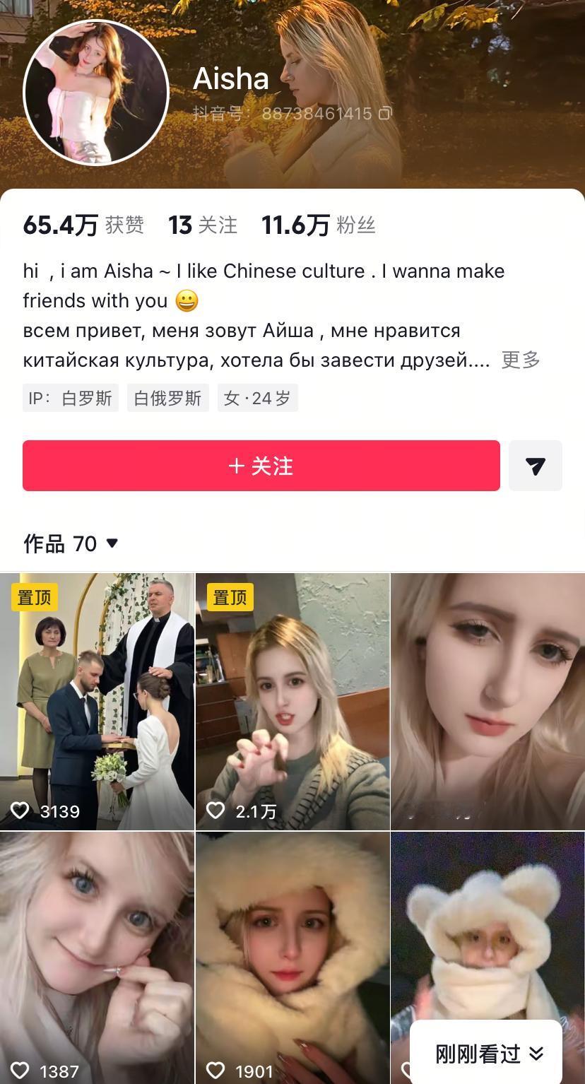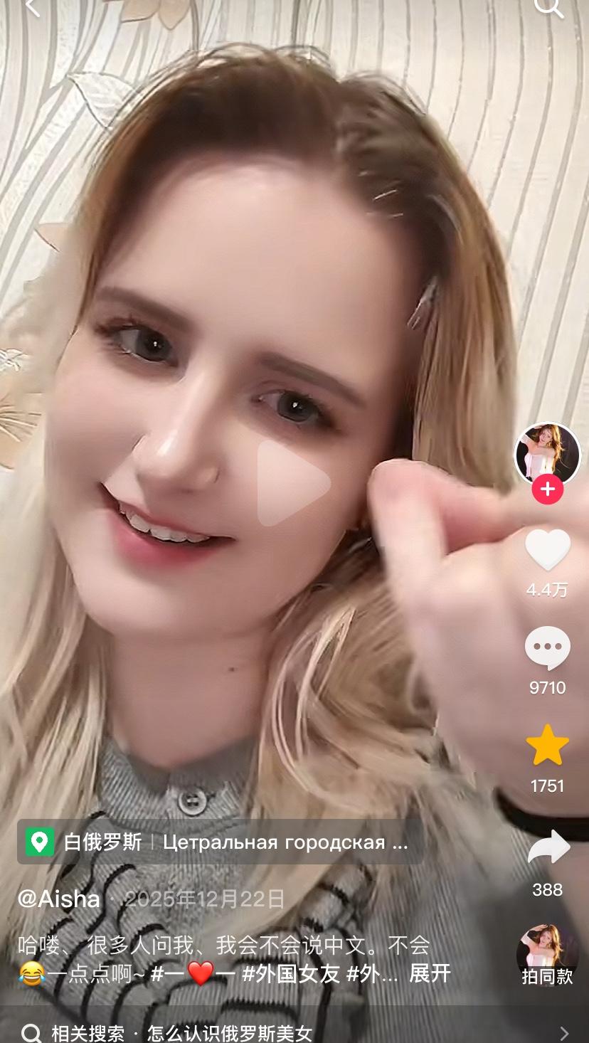 白俄美女只会一点点中文,平时发视频,要么放音乐,要么不说话,网友们照样进去评论,人家粉丝到11万了。这气质,如果参加选美大赛,一定能获奖,脸、鼻子、眼睛、嘴、头发都是耐看型!
