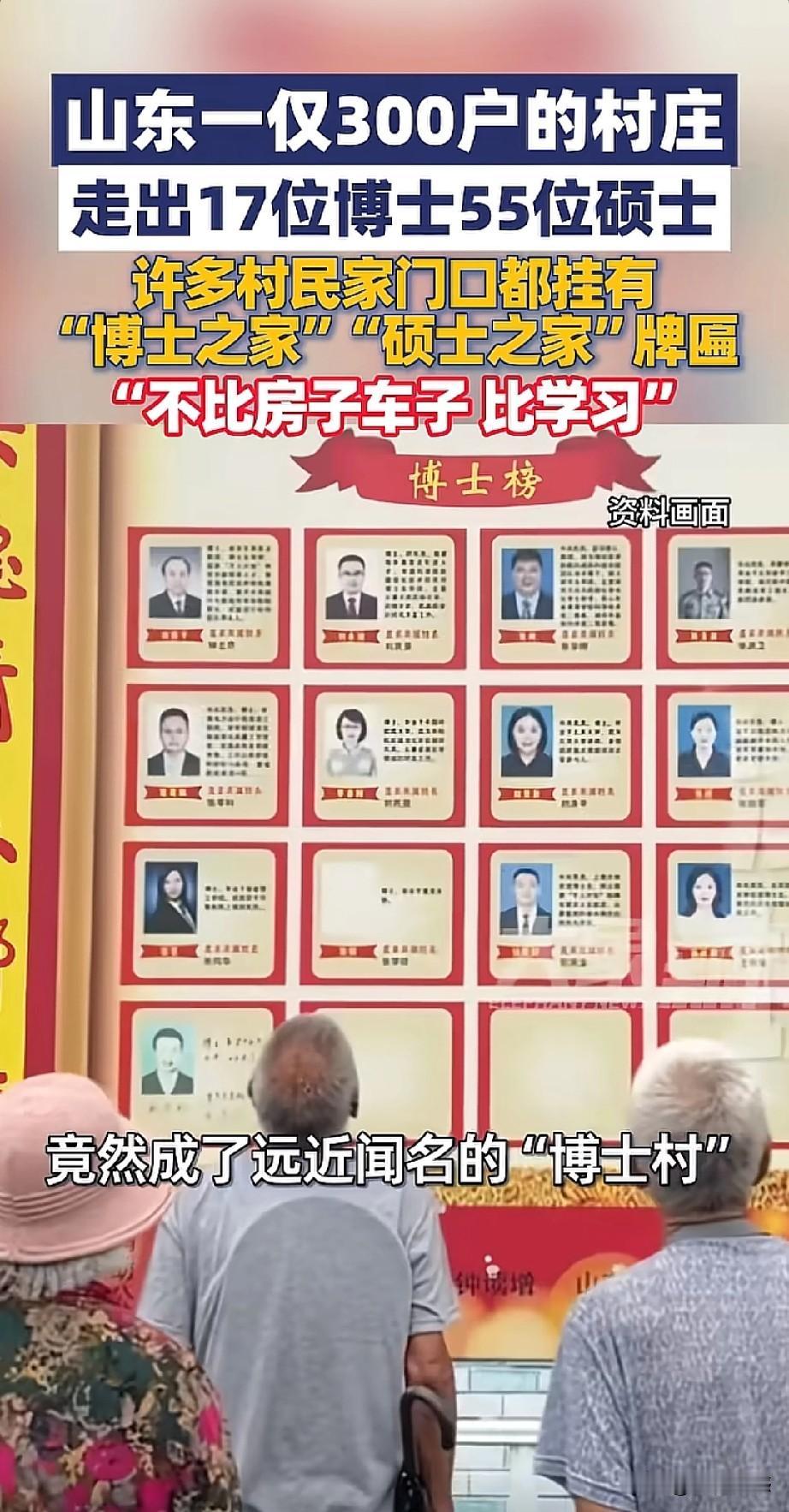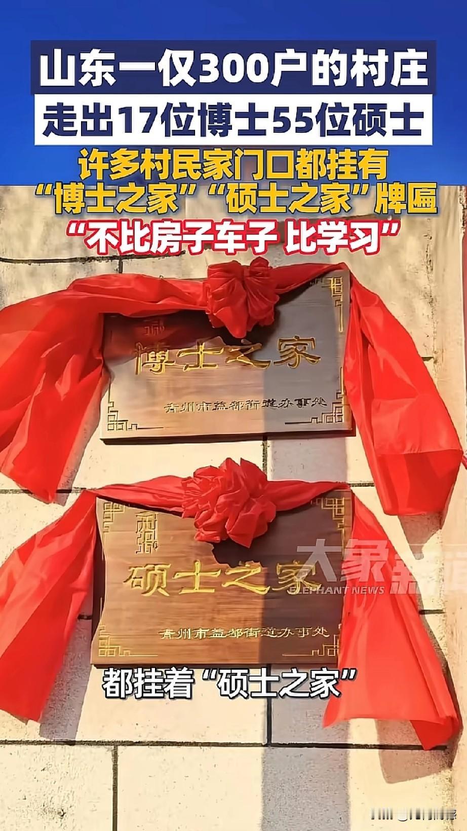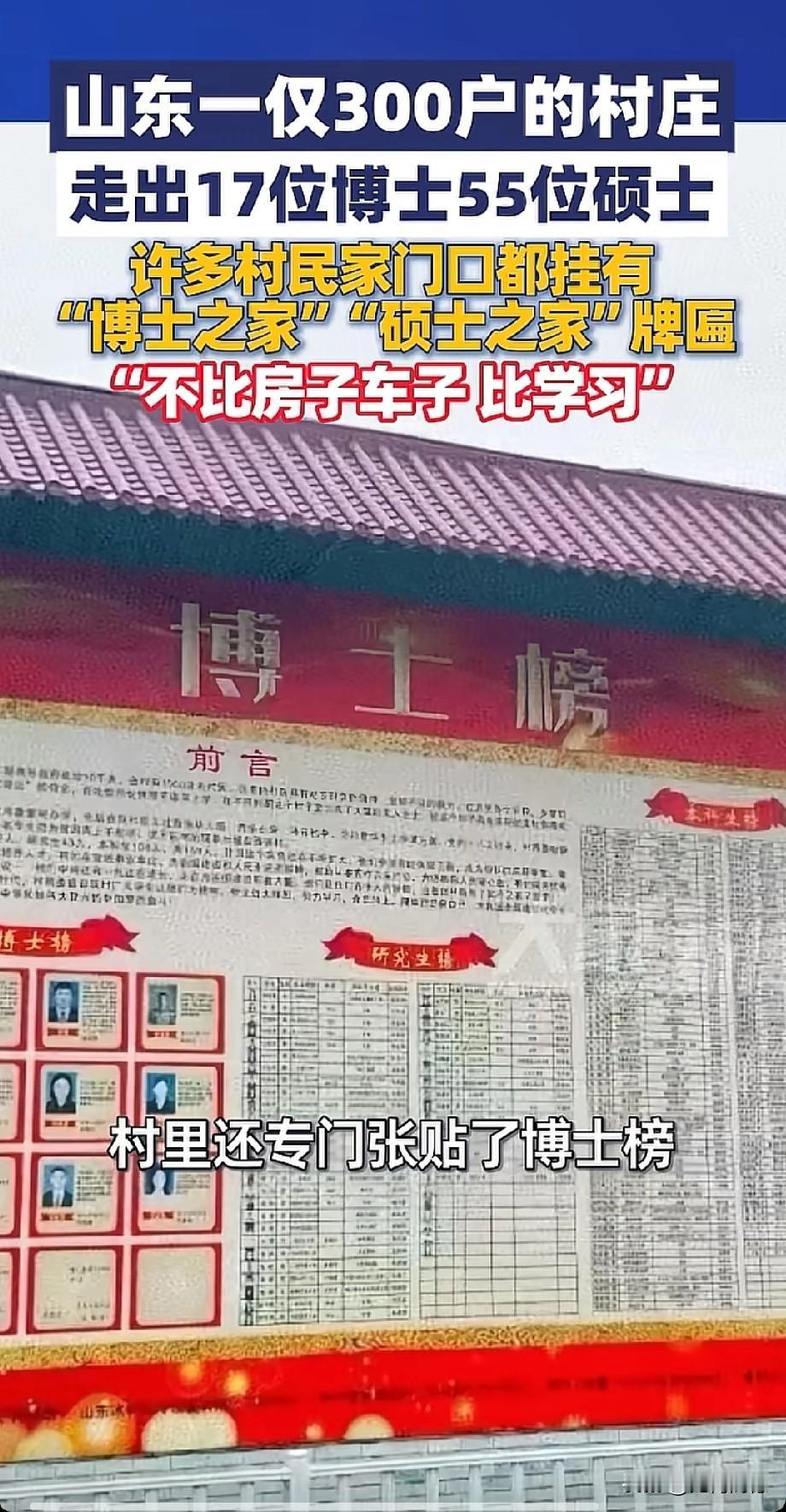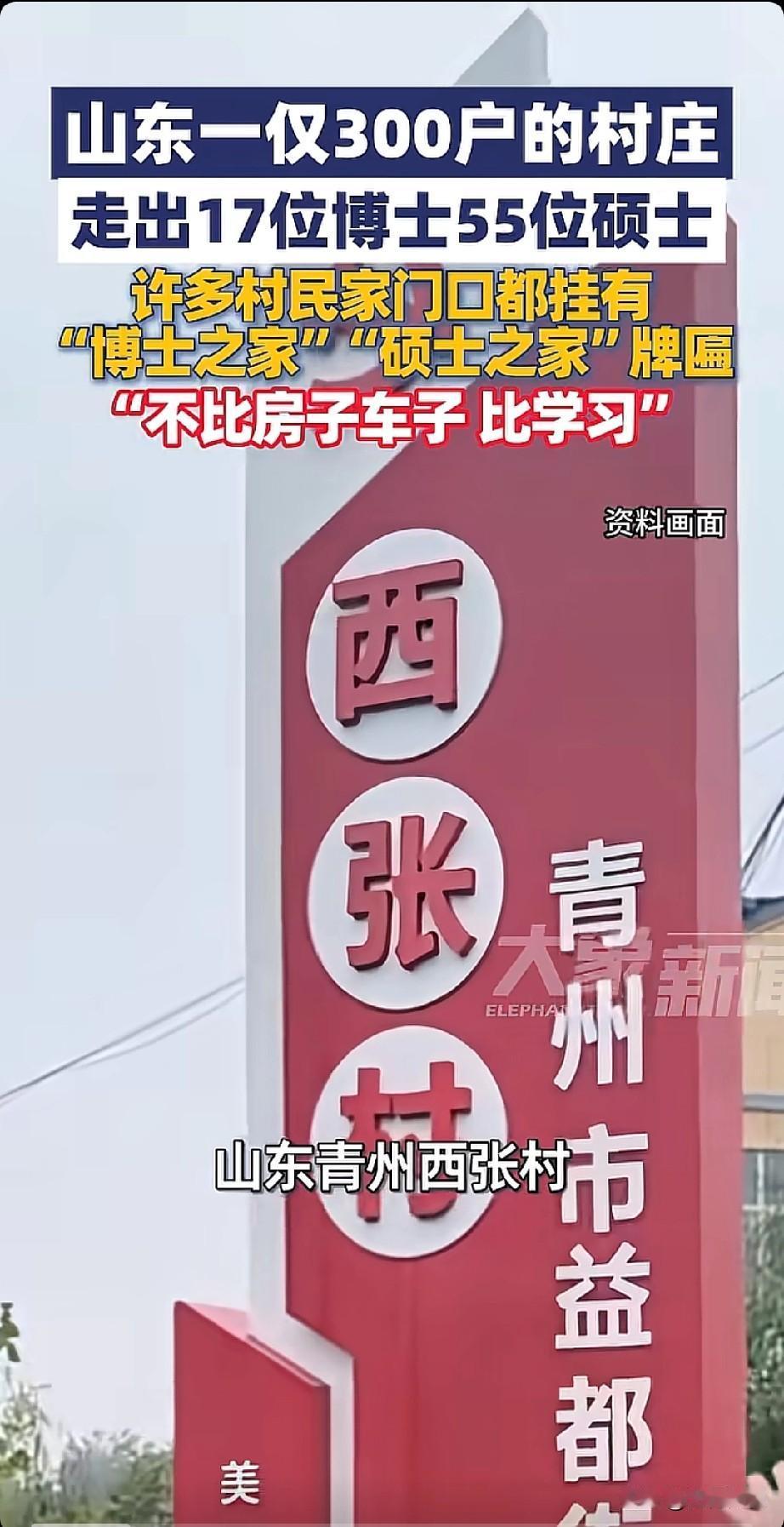 山东有个远近闻名的博士村,这个仅有300户、1074人小村子,自恢复高考以来,竟然走出了17名博士、55名硕士、104名本科生,这个小村子就是青州市益都街西张村,在这个村子里,村民不比房子,不比车子,专门比孩子们的学习成绩,家家户户都形成了培养孩子学习的浓厚氛围,这个村子的风气真好,必须为这个村子点赞!