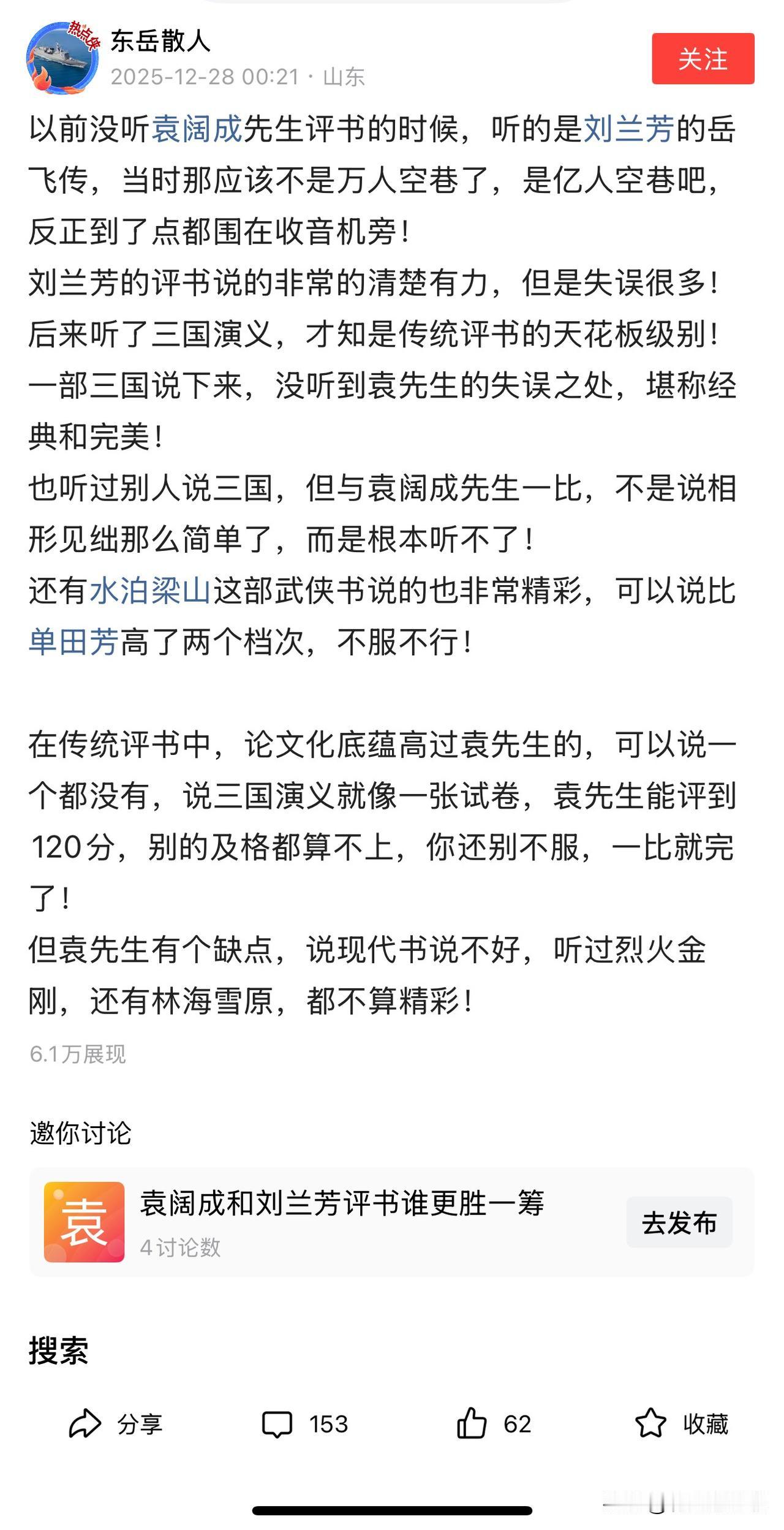 袁阔成确实是评书名家,一代宗师那样儿的。 我小的时候,最先接触到的是刘兰芳的《岳飞传》,一到中午放学,走到马路电线杆下就走不动了,因为上面的大喇叭正播放《岳飞传》,非得听完才跑回家吃饭,没办法,家里那个时候还买不起收音机。 后来又听到田连元的《杨家将》,听的是荡气回肠。家长不给买收音机,就跟着《北京晚报》自己做了一个矿石耳机,不能调台,只能收听中央广播电台一个台。 于是听到了袁阔成的《三国演义》,说实话,真听不进去,不过呢,虽然听不进去,但总觉得有一股正规军的气势,不慌不忙、不急不恼、不紧不慢、不温不火。一直平铺直叙,找不到高潮点,慢慢也就弃之不听了。 后来长大后,又听过一次他的《三国演义》,这次是心平气和的听,听他慢慢讲,也就听进去了,但始终找不到听评书那种跌宕起伏、心潮澎湃的感觉。 做一个不太恰当的比喻吧,如果开书馆卖票,袁阔成不一定能干过单田芳。 一家之言,轻喷 ——————————