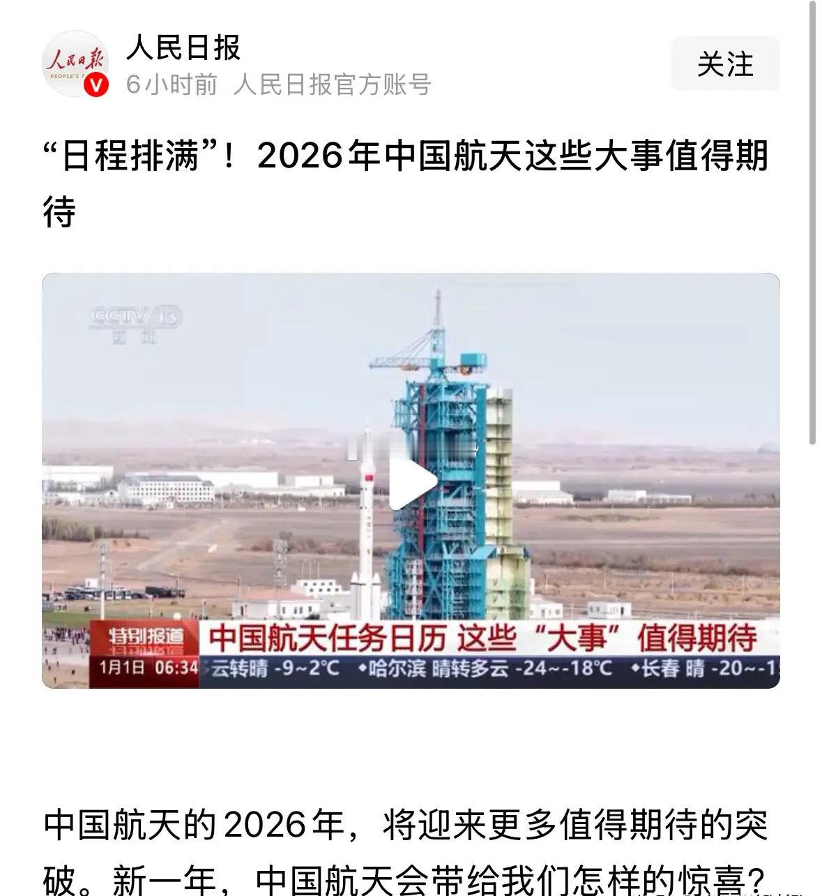 人民日报和央视发布重磅利好消息,2026年中国航天日程排满:2026年1月1日人民日报官方账号发布重磅利好消息,央视也报道了,2026年中国航天日程排满。这意味着节后商业航天还会有跨年行情。2025年12月初我就说了,商业航天无论是产业规模还是技术含量,都比当年的低空经济要强很多,所以无疑会是跨年主线,看到的人12月逆势赚大钱了。估计一月商业航天还有行情,不信点赞关注节后再看。a股财经林俊杰 最近的这些事真的有点烦