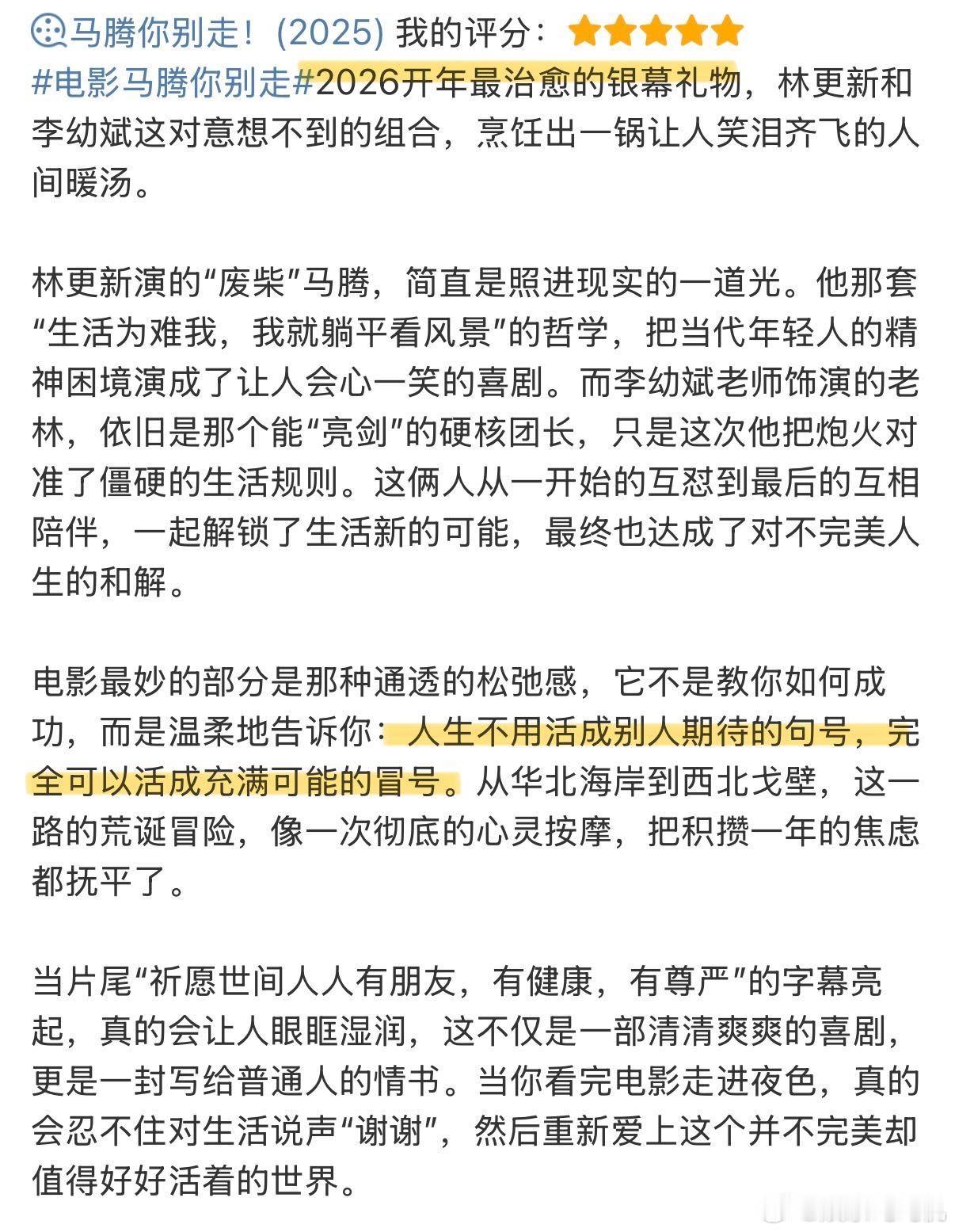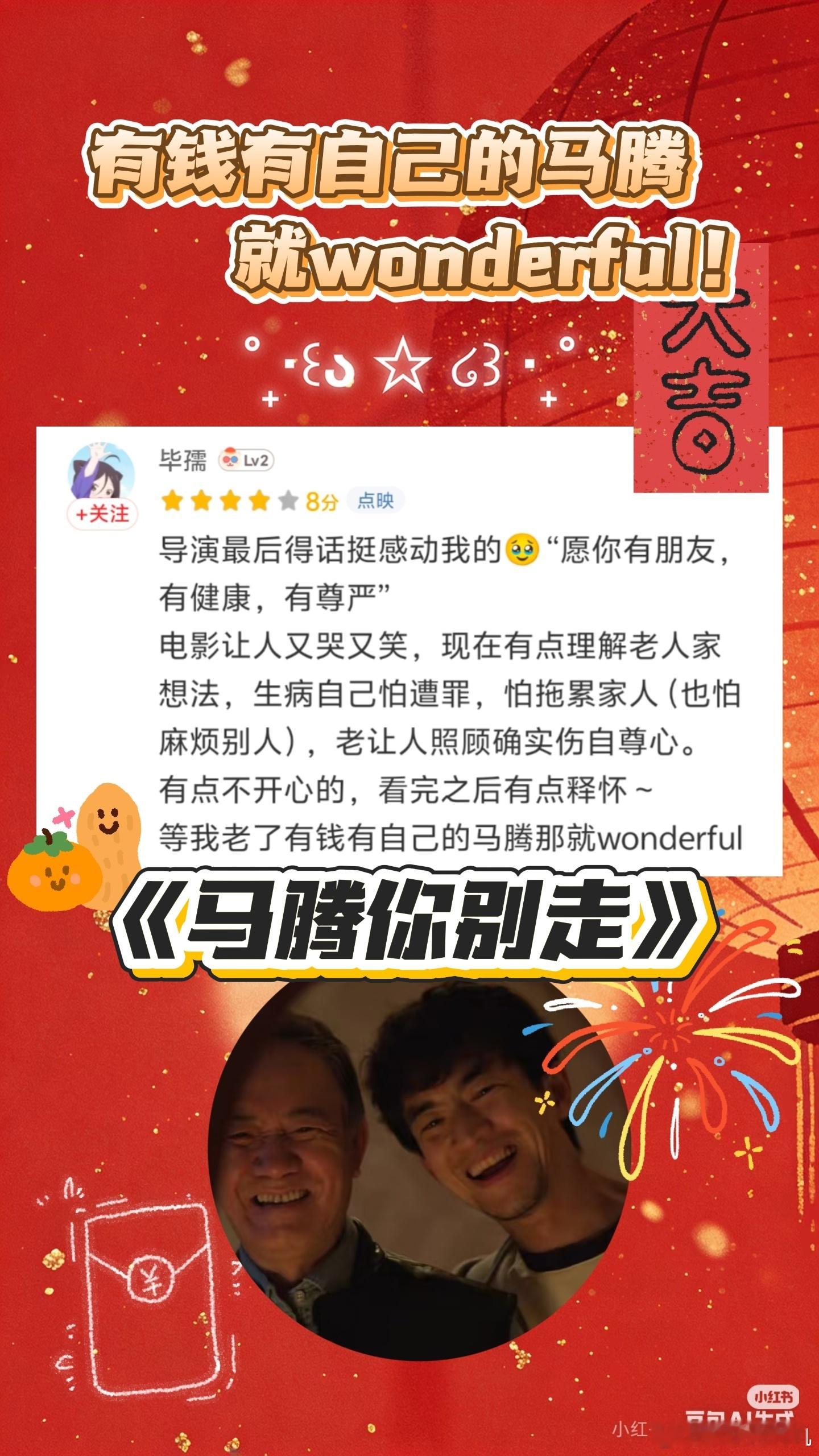 寻死觅活出忘年版注解了 没有炸裂视效却后劲十足,《马腾你别走》用生活化的剧情打动人心。老林的无价值感与马腾的生存焦虑,在忘年交中慢慢消解,温暖治愈着每个观影人。