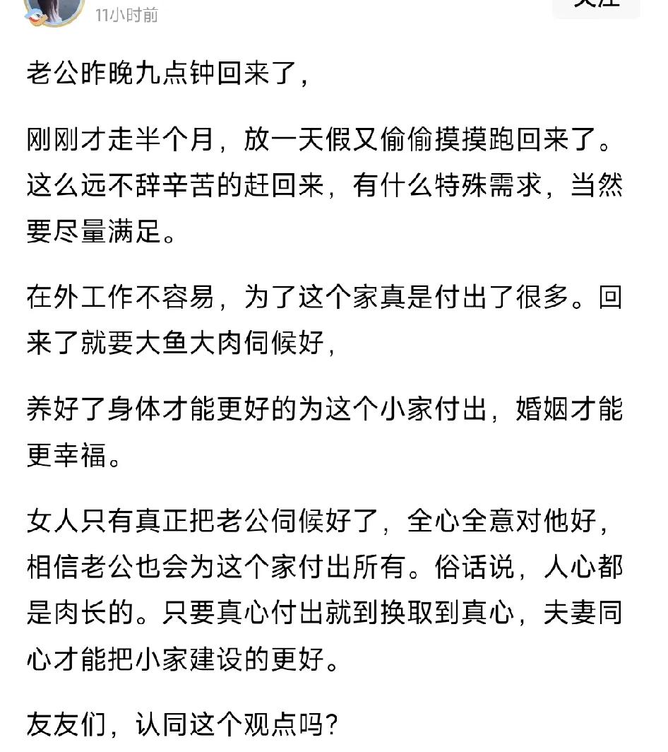 老公昨晚又回来了,才走半个月,放一天假又偷偷摸摸跑回来了。有网友发文说,这么远不辞辛苦赶回来,有什么特殊需求,当然要尽量满足。​在外工作不容易,为了这个家真是付出了很多。回来了就必须大鱼大肉伺候好,一晚上都要不停地把他喂饱,让他心意满足,让他感受到妻子的温柔和暖心,只有身体得到了满足,才能更好的为这个小家付出,婚姻才能更幸福。对啊!必须解决好夫妻的生活问题,才能幸福,婚姻生活占比为99.754%看看数学就明白了。这个女人真聪明。有此贤妻,夫复何求?夫妻同心,黄土变金! 有网友发文说,那是你老公对你不放心,回来看看隔壁王哥在你家还是不在。​做女人必须爱自己,不能有其他想法,女人只有真正把自己的老公伺候好了,全心全意对他好,让他舒舒服服,相信老公也会为这个家付出所有。俗话说,人心都是肉长的。只要真心付出就到换取到真心,夫妻同心才能把小家建设的更好。 还有网友发文说,这老公也太暖了吧!放一天假还特意跑回来,肯定满心惦记着这么漂亮的媳妇。能理解他的不易,也愿意满足他的小需求,这样的双向奔赴太让人羡慕了,好好享受这短暂的相聚时光吧! 我觉得,你老公回来可不是为了你,是想“孩子”了,我们以前都用的这个借口。有你这样的好媳妇再苦再累也是甜蜜的!丈夫出差回家 丈夫不定期回家 丈夫出差 老婆看望老公 跟老公旅游 带老公出游 让老公回家技巧