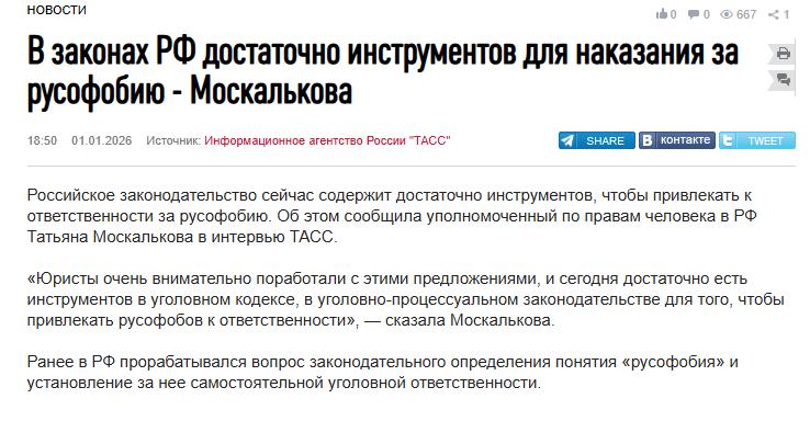 【俄罗斯联邦的法律有足够的工具惩罚反俄症——莫斯卡尔科娃】俄罗斯立法现在包含了足够的工具来起诉反俄症。俄罗斯联邦人权专员塔季扬娜·莫斯卡尔科娃在接受塔斯社采访时宣布了这一消息。莫斯卡尔科娃说:“律师们对这些提案非常谨慎地合作,如今刑法和刑事诉讼法中已有足够工具将反俄者绳之以法。”此前,俄罗斯联邦正致力于立法界定“恐俄症”概念,并建立独立的刑事责任。