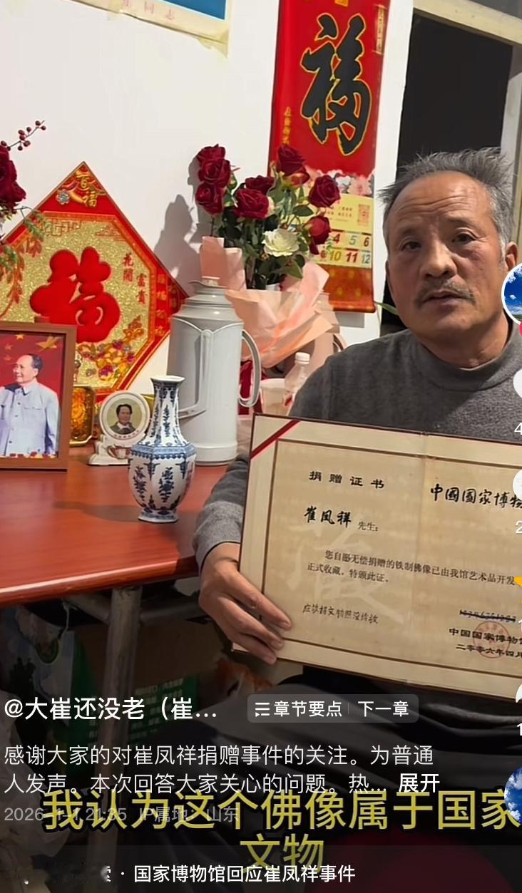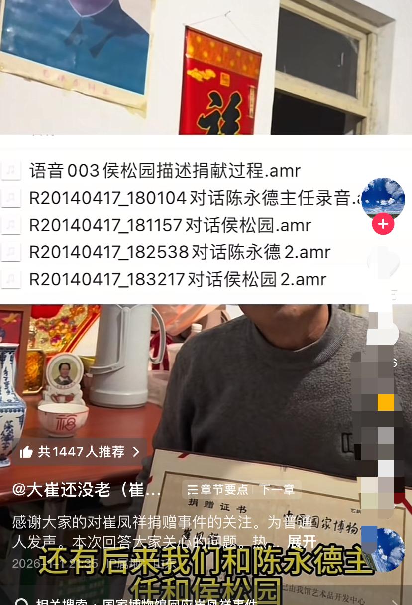 崔老汉为了给捐赠的文物讨说法,去十几次博物院,写了七八十封信都没有得到解决 2006年崔老汉捐给北京博物院一尊佛像,他认为文物是国家的就应该交给国家,让很多人能够看到。于是崔老汉背着重达40斤佛像坐了一天一夜的绿色火车去了北京博物院,当场把文物捐给了博物院正式工作人员侯松元,在场的还有其他四五个工作人员, 博物院颁发了捐赠证书,还有回赠的带有国家博物馆标志的纪念瓷器一件。还有陈永德主任、侯松元捐赠过程的电话录音。 三年后崔老汉得知捐赠佛像没有在博物院并且不知去向,去了十几次北京,写了近七八十封信,一直没有解决。 根据崔老汉提供的证据,捐赠回赠品青花瓷瓶底盖有博物院的印章还有现场捐赠录音以及证书,可以证明崔老汉确实捐赠了佛像给博物院。 捐赠物具体去了哪里相信很多人都心知肚明! 经办人做梦没有想到崔老汉几年后要求看看文物,结果露馅了,这帮骗子以为捐赠人捐赠后不会看捐赠的文物了,所以动了歪心思。 更可耻的是崔老汉反映了16年都没有给予解决,现在只有网上举报但视频也被下架了,一系列的问题到底是哪里出了问题?实事求是的反映问题的视频也给 下架,还有人管吗?