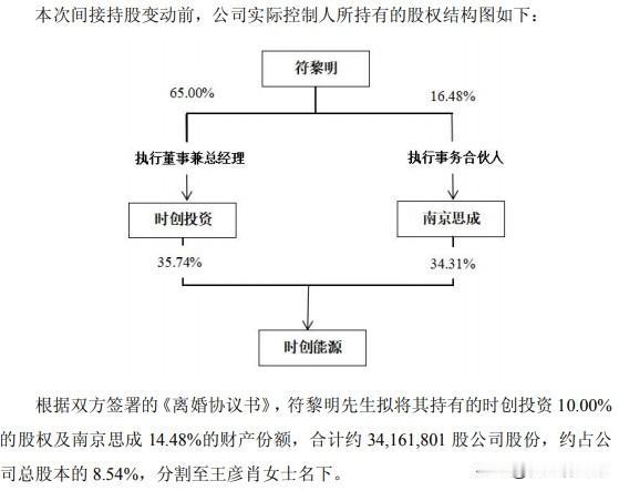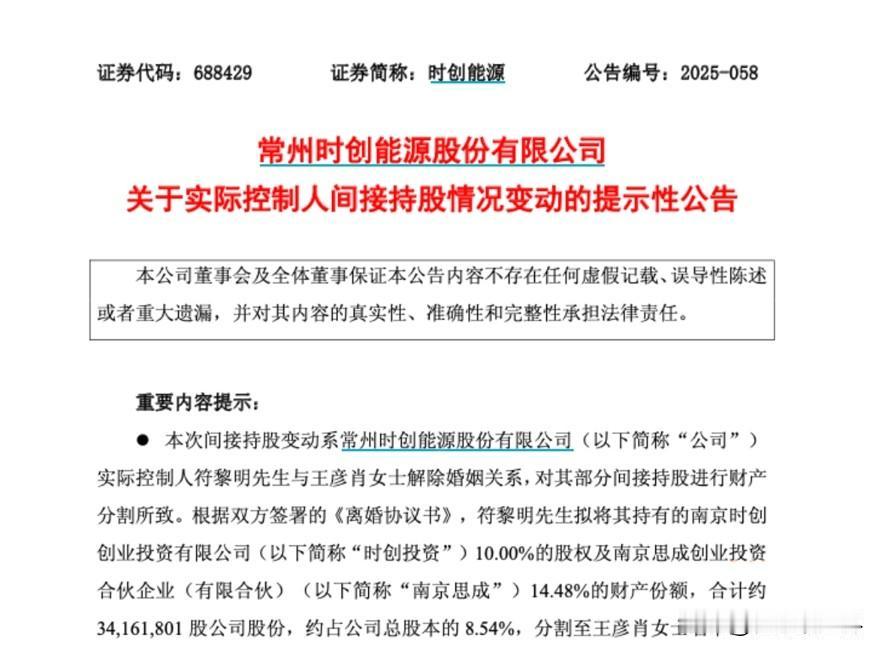 4.46亿“分手费”炸锅科创板!时创能源老板离婚,前妻分走8.54%股份,控制权却纹丝不动? 2025年最后一天,科创板光伏企业时创能源(688429)一则公告让资本市场炸了锅:实控人、董事长符黎明与前妻王彦肖离婚,女方通过分割两家控股公司股权,间接拿到约3416万股股份——按12月30日收盘价13.07元/股算,这笔“分手费”市值高达4.46亿元,占公司总股本的8.54%。 但更让人好奇的是:分走近一成股份,公司却强调“控制权没变更”?答案藏在两家“持股平台”里:符黎明原本通过时创投资(持股35.74%)和南京思成(持股34.31%),合计支配公司70.04%的表决权;离婚后,他只是把这两家平台的部分股权转给前妻,核心持股平台持有的上市公司股份没动,自己仍能掌控超70%表决权,实控人地位稳如泰山。这种“上层股权分割、底层控制权不变”的操作,也被业内称为高净值人群离婚的“商业缓冲术”。 不过这事儿绝非个例。近年来A股“天价离婚”早已成高频戏码:康泰生物老板曾分走235亿股权,三六零周鸿祎离婚涉及近90亿股份,今年威士顿、纵横股份等公司实控人离婚,分割金额也都超4亿。但热闹背后藏着隐忧:中国社科院柏文喜指出,部分案例打着“离婚”幌子搞“变相减持”,比如原配偶拿到低于5%的股份后,可规避“大股东减持”的严格监管,悄悄抛售影响股价;更有甚者因股权分割导致实控人变更,公司战略突然转向,中小投资者成“冤大头”。 再看时创能源自身,这场离婚来得不算时候。作为浙江大学博士团队创立的光伏企业,它2023年科创板上市时发行价19.2元,如今股价已破发;2025年前三季度虽营收增长54.3%至7.048亿元,但仍亏损2.544亿元,正处行业复苏的关键期。更值得注意的是,分割的股份是IPO前限售股,距解禁只剩半年——未来王彦肖若减持,会不会给本就承压的股价再添压力?这也是投资者最关心的问题。 其实“老板离婚”从来不是单纯的家务事,而是上市公司的“治理考题”。时创能源这次能稳住控制权,靠的是提前搭建的持股平台架构,但并非所有公司都有这样的“缓冲垫”。要想平衡个人财产分割与公司稳定,一方面需要监管层完善规则,比如要求离婚股权分割提前披露减持计划,杜绝“暗箱操作”;另一方面,企业也得提前做好股权规划,避免婚姻变动变成资本市场的“黑天鹅”。 互动话题 你觉得上市公司老板离婚,该优先保住公司控制权,还是优先公平分割财产?如果你的持仓股突然曝出“天价离婚”,你会选择加仓抄底还是果断止损?评论区聊聊你的看法,让更多人看清背后的风险与门道!