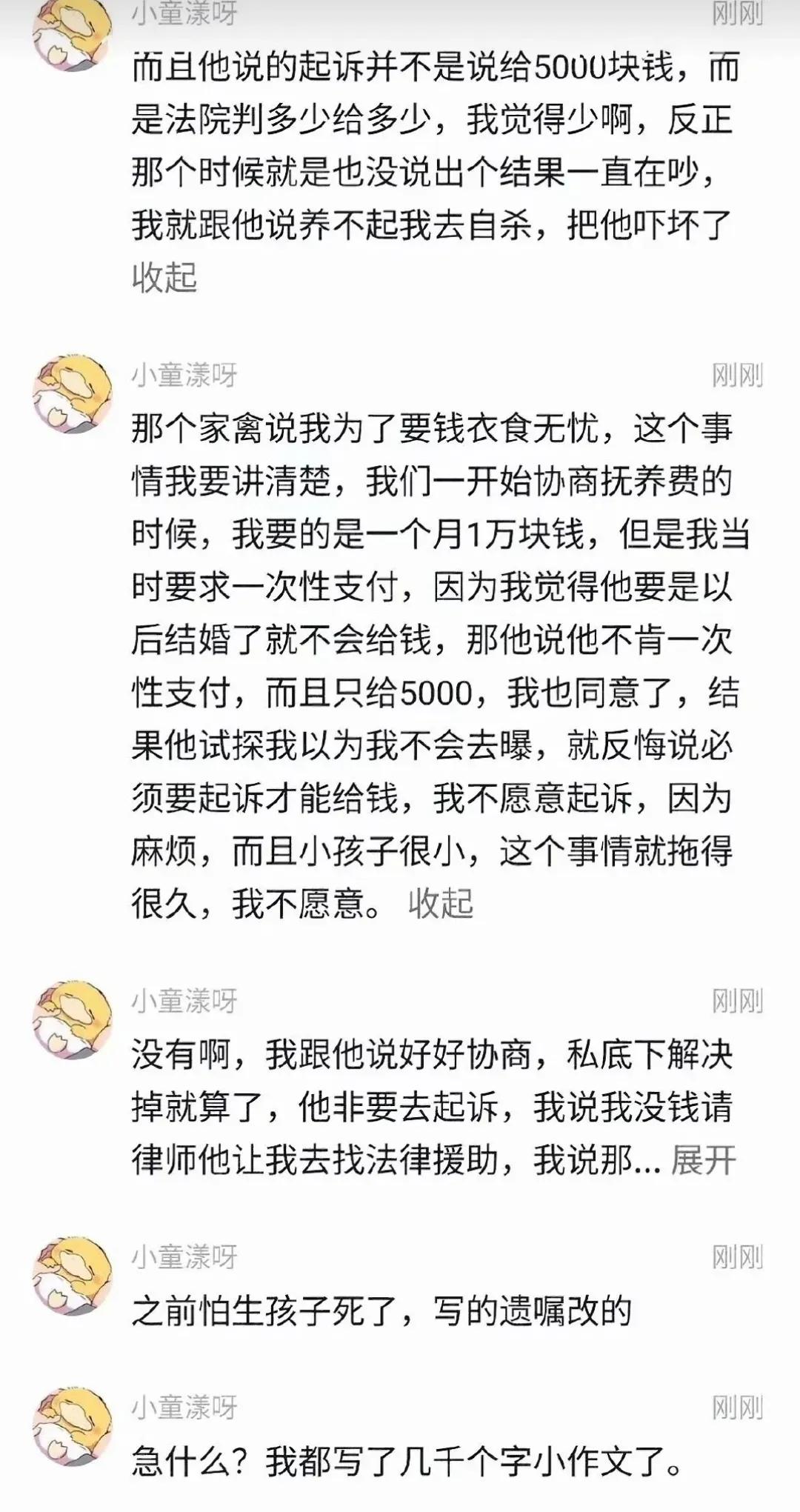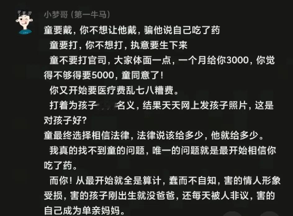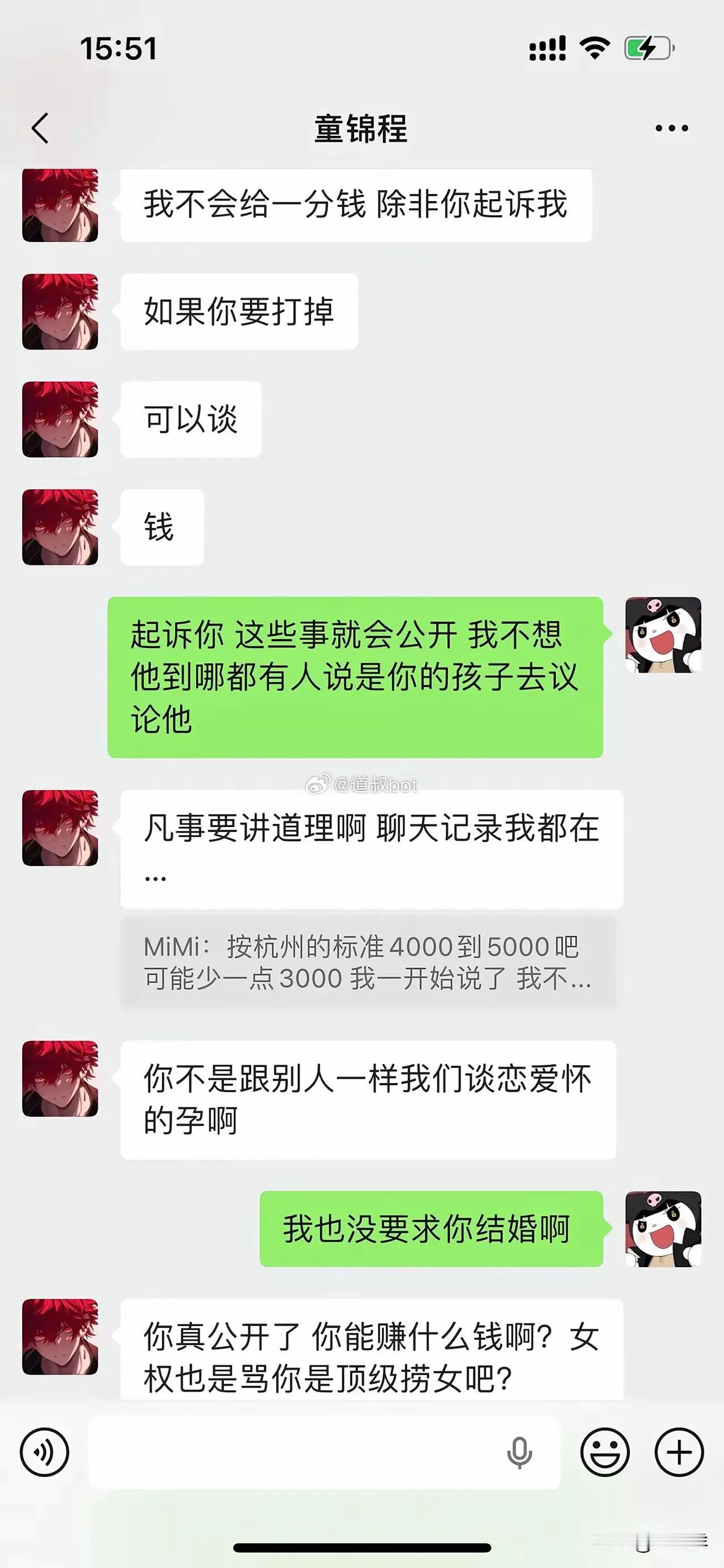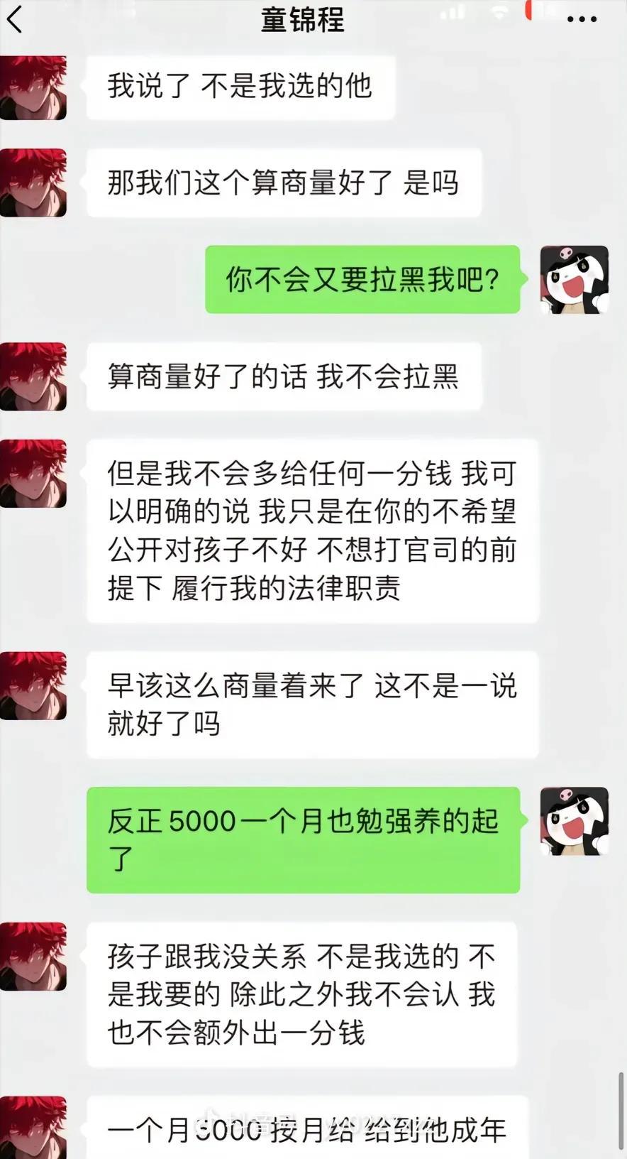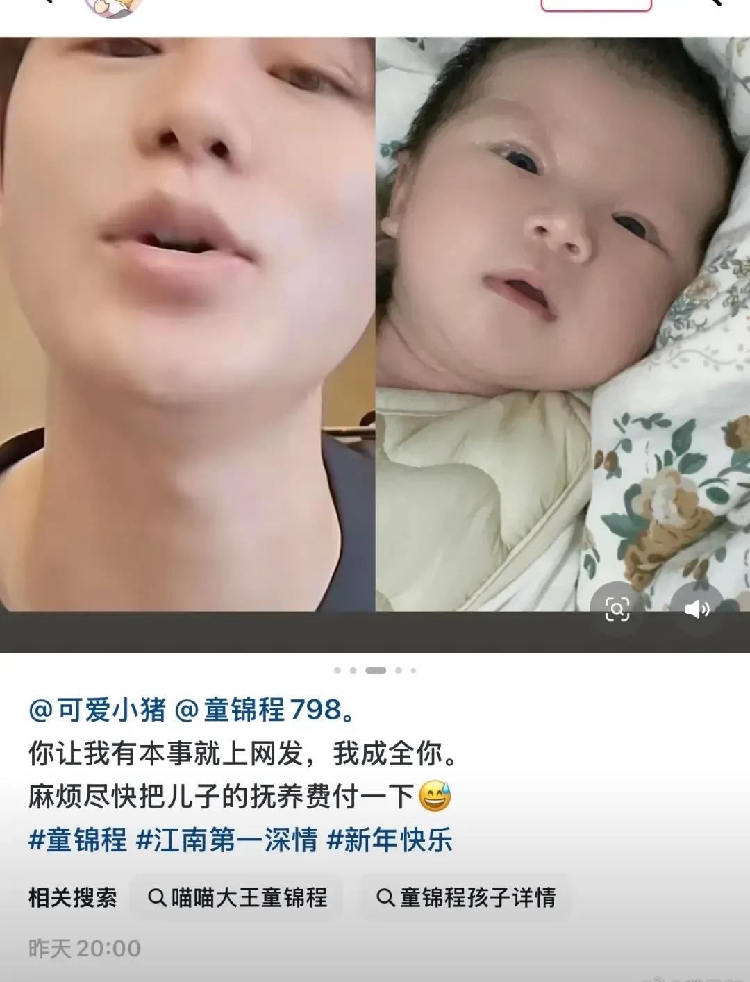 童锦程居然有儿子了,和前女友生的。女的是福建的,今年30岁。就算不做亲子鉴定都看得出来孩子和童锦程很像。两人聊天记录也都爆出来了。 但童锦程又不承认自己与女方是恋爱关系,所以也算不上前女友,只能算是情人关系。 两个人在一起持续了一年多,女的吃短期避孕药,但是却怀上生了孩子。 女的很喜欢童锦程,想生下他的孩子,童锦程不想要这个孩子,商量着打掉给一笔钱,女的不同意。孩子生下来后,女方要抚养费220万。童锦程只愿意一个月给5000,没商量好,女方把事情曝光到网上。
