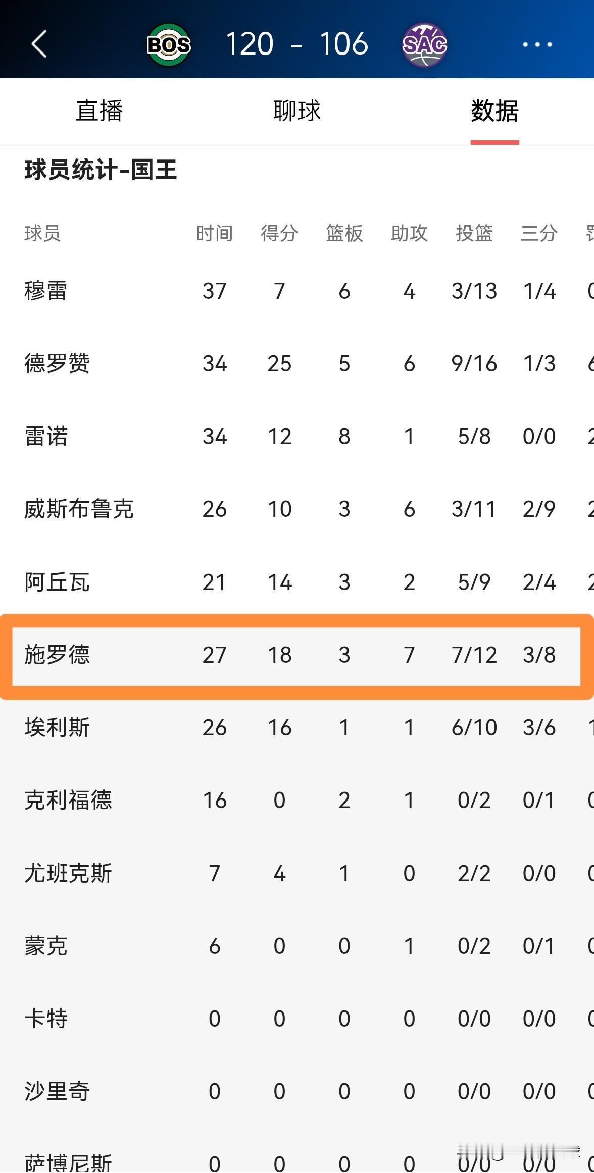 国王大将施罗德真是太憋屈了!在今天国王主场以106:120输给凯尔特人的比赛中,施罗德替补出战27分钟,投篮12中7,其中三分球8中3、罚球1中1得到18分3篮板7助攻,他的场上正负值为-5。老实说,以施罗德的能力来看,他完全有资格出任球队的首发控卫,但是目前国王的首发控卫依然被威斯布鲁克牢牢的占据着,事实证明,威少的表现完全对不起自己的首发位置。 如果我是施罗德的话,让我给威少打替补,我会感到非常憋屈。