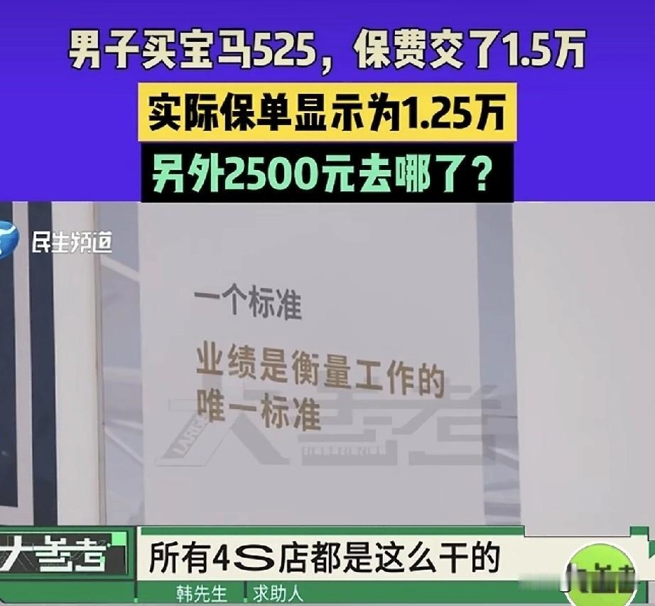 一当又一当,当当不一样!河南郑州,一31岁男子花285500元买了一辆宝马525,又花15000办了保险,谁知回来后发现,朋友买的80万路虎保险费只有12000元,男子一查保单,发现实际出保费只有12500元,买车时承诺送的店内全损险收了他2500元,男子不愿意了,送就是送,买就是买,为啥提起不说清楚?4s店: 所有4s店都是这么干的! 韩先生为了生计,十五六岁就外出打工,他风里来雨里去,终于在31岁时,有了自己的一些积蓄。 他从小到大,都有一个梦想,他想拥有一辆属于自己的宝马525。 12月22号,他拉上妻子,来到一家4s店里,花了285500元买了一辆宝马525。 可是这个数字,只是裸车的价格,要买保险,还得另外再交15000元保险费用。 买车时4s店承诺,给韩先生送店内全损险,韩先生非常高兴,立刻就缴费并签下了自己的名字。 手续办完,韩先生把车开回家了,他停在自己家的车库,他坐立不安,晚上12点还到车库又看了看车。 他坐进车内,恍如隔世,他想起来小时候的愿望,到现在终于圆了梦想,他在车内研究了半天,抑制不住的喜悦之感。 可万万没有想到,他刚高兴了一天,糟心事接踵而来。 原来,韩先生缴纳了15000元的保费,他以为是宝马,所以才有这么贵的保费。 谁知他开车出去要朋友观看,朋友告诉他说,自己花80万元买的路虎卫士,保险费只有12000元。 韩先生就奇了怪了,你80万的车保费1.2万,我这20多万的车保费咋能这么贵呢? 韩先生立刻回家拿出自己的保单,他仔细一看,果然发现了问题,保单上显示,实际保费只有125000元。 韩先生立刻明白过来,他买车时,当时店里给他承诺,保费15000元,再给他赠送店里的全损险。 可是到现在一看,这送的全损险竟然变成了是自己花2500买的了。 也就是说,实际保险出保是12500元,剩下的2500元,又被买成了所谓的店里的全损险! 而这个全损险当初说好是送给韩先生的,现在变成自己花钱买的,韩先生不愿意了,立刻找了店里的销售。 可销售却说,你送的也需要转钱! 韩先生惊呆,买的跟送的咋能一样?承诺的跟说的都不一样,你这是心口不一,这不合理! 谁知销售的回答更加让他难受,销售表示: 这东西都是我们团队研究好的,所有4s店都是这么干的! 韩先生急了,无论如何,这钱你得给我退了。 但销售又说,这是公司正常收费,你要不信,你可以去别的店里看看。 韩先生气的火冒三丈,你这么有名气,怎么能干出这样的事情,韩先生请来记者,记者陪同他来到4s店里。 韩先生拿出保单,保单上明明白白的写着:送全损险! 可4s店态度冷漠,说这笔费用单上,是韩先生自己签字画押的,原本就是15000元,其中包含了全损险的。 可韩先生认为,你并没有给我说过,是买的这个险种! 但销售咬死,他们没有多收韩先生任何的费用。 记者上前询问,你们这保险到底是买的还是送的?店里是卖车还是卖保险的? 不是说保险费是15000元吗,为何出保单上却是12000多元? 可销售不给解释,也拒绝回复,记者又问,那消费者买车时你也是这个态度吗? 随后,店里对接人员拿出购买明细,上面显示有韩先生购买时的签字。 可2500元那里显示,是购买了一项gap。 记者就奇了怪了,那你这个gap是啥?正常人能看出来这是全损无忧险吗? 韩先生又问,你们出的这个合同明明是全损服务合同,结果到了你们那个消费明细上却显示是gap?你这对不上啊? 你们光让消费者签字,消费者压根就不知道gap是啥意思,你既然如此,你为啥不写上全名,为啥要用gap来代替? 可对接方认为,购买时销售顾问肯定给韩先生做过解释,可是她没有证据,口说无凭。 之后,对接方无法回答,表示会去了解一下情况。 韩先生要求解决问题,对接方表示,现在非工作日,上报不了,需要下周一才能往上汇报。 韩先生焦急,我买车时花了2个小时,现在要解决问题,却要一个星期。 最终,店里表示,会在下周一中午前给韩先生答复。 确实,2500元钱不算太多,但买就是买,送就是送,你就应该提前说清,让消费者自己选择才是正确的做法。 《民法典》第496条规定: 提供格式条款一方应采取合理方式提示对方注意重大利害关系条款,并按要求说明;未履行义务致使对方未注意或理解的,对方可主张该条款不成为合同内容。 4S店以gap缩写标注全损险,未明确其含义及收费,且无证据证明已向韩先生解释。 韩先生可主张2500元收费条款不生效,要求返还费用。 《消费者权益保护法》第55条规定: 经营者提供商品或服务有欺z行为的,应退一赔三。 4S店承诺送全损险却收费,以缩写隐瞒真实收费,若能证明4S店存在故意欺z,韩先生可要求退费,还可要求赔偿。 @王哥说法 多学法律少吃亏