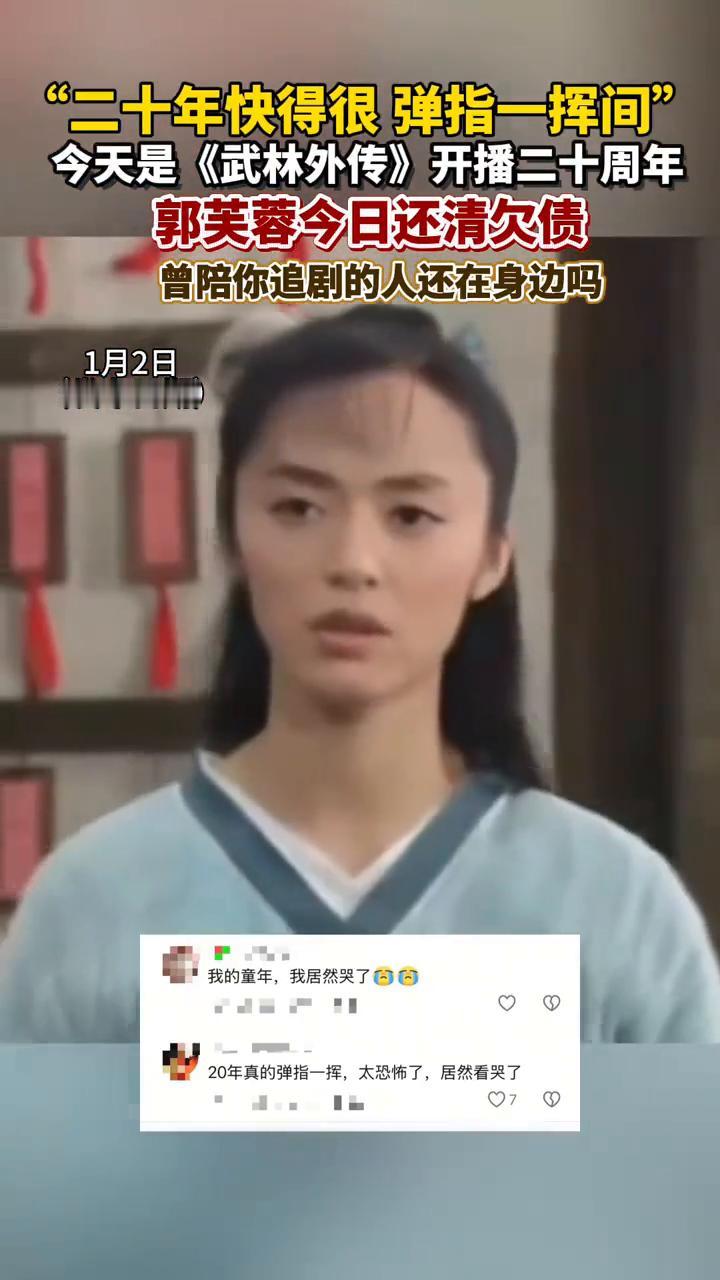 "二十年快得很弹指一挥间",今天是《武林外传》开播二十周年,郭芙蓉今日还清欠债,曾陪你追剧的人还在身边吗? 1月2日(发布日期),20年前的今天《武林外传》首播,佟掌柜当年那句竟照进现实。20年之约将至,"郭芙蓉"也正式还清债务可以离开同福客栈了。 我的童年,我居然哭了。20年真的弹指一挥,太恐怖了,居然看哭了。没想到,这"弹指一挥",就是一代人的青春。 当时看过武林外传的朋友,你们现在都多大了?资料显示《武林外传》是北京联盟影业投资有限公司出品,由尚敬执导,闫妮、姚晨、倪虹洁、沙溢、喻恩泰、姜超、王莎莎等人主演的古装武侠喜剧。 网友评论:那些刻进DNA的台词和名场面至今仍是社交硬通货:白展堂的"葵花点穴手"、郭芙蓉的"排山倒海"、吕秀才的"子曾经日过"、佟湘玉的"额滴神啊",随口一说就能引发全场共鸣。