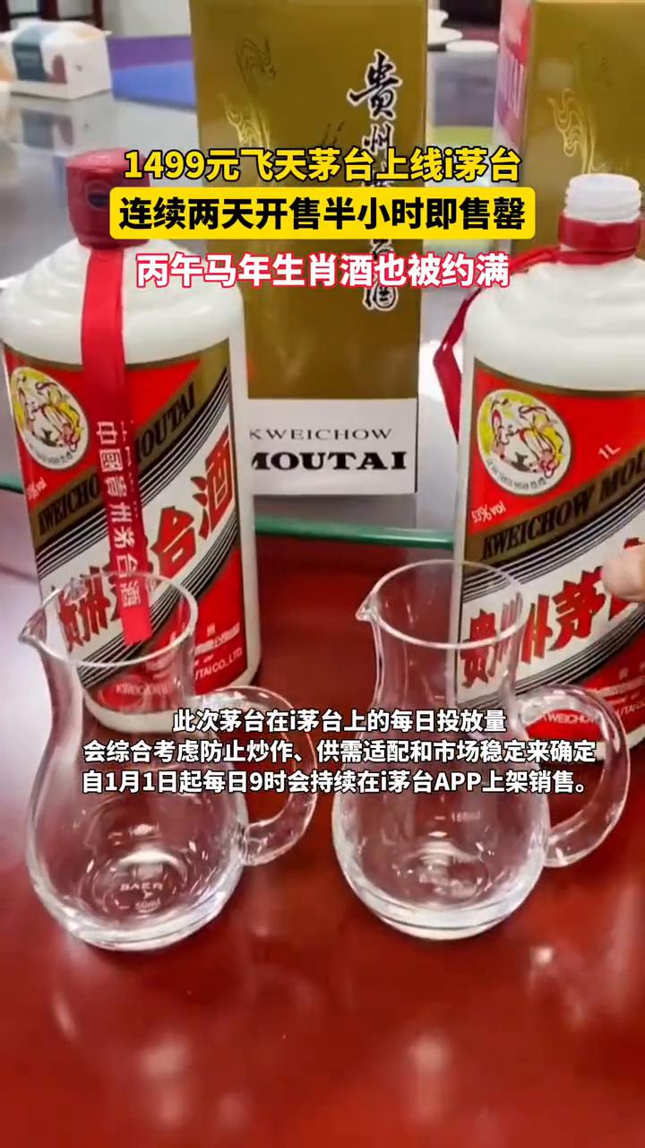 1499元飞天茅台上线,i茅台连续两天开售,半小时即售罄,丙午马年生肖酒也被约满。 茅台今年正式上线的1499的飞天,2026年的每人每天是限购12瓶,现在也是没有溢价部分了。 1月2日,茅台该产品再度被秒光。上午9时开售,1分钟内显示访问人数过多,请在2026年01月02日09:30前下单,随后显示补货中,之后每隔5分钟补货一次,商品总价均瞬间售空,9时25分显示已售罄。 此次茅台在i茅台上的每日投放量会综合考虑防止炒作、供需适配和市场稳定来确定。