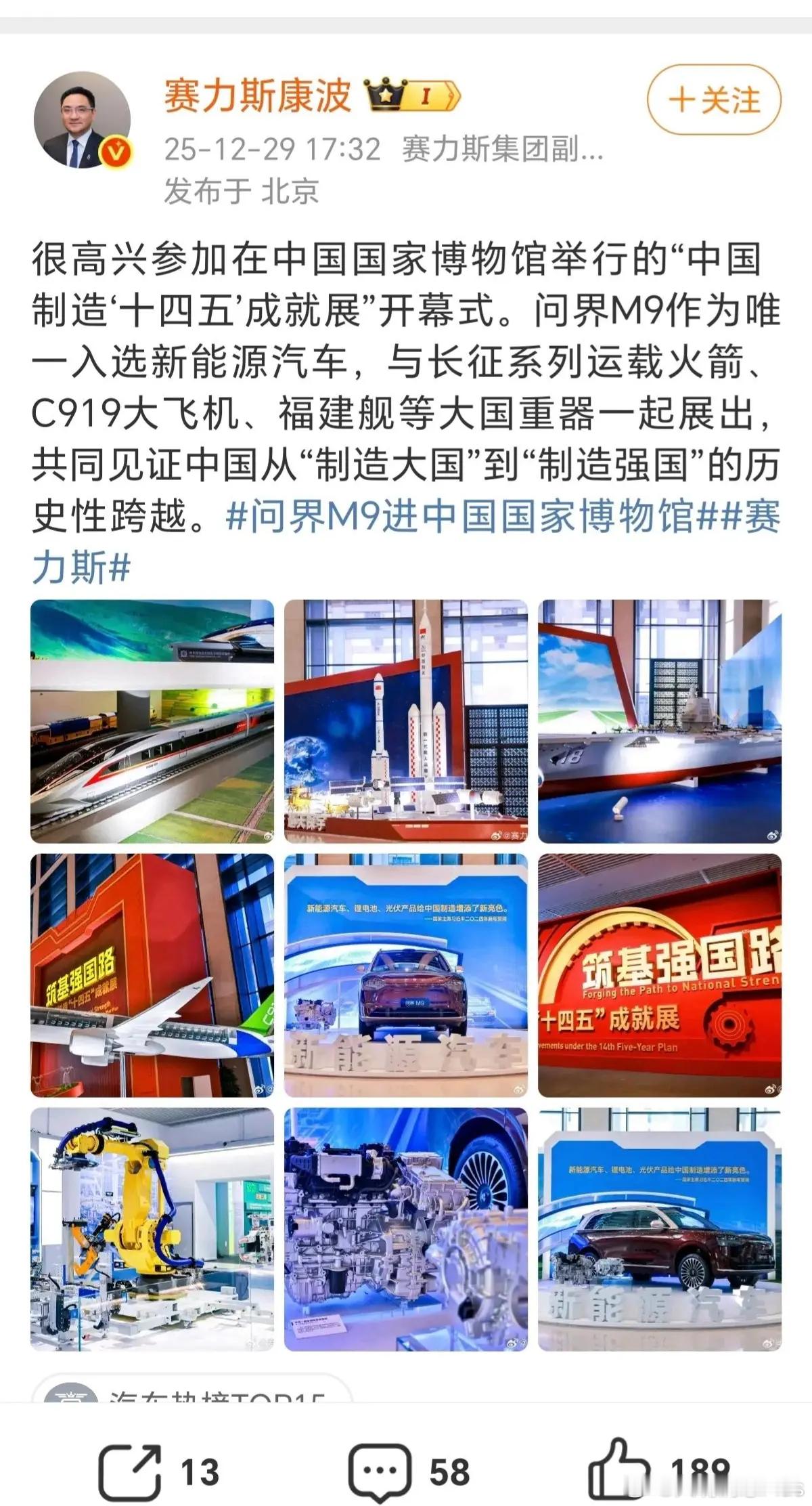 不知道黑子们会如何评价,中国国家博物馆把问界M9选为中国新能源车的代表?