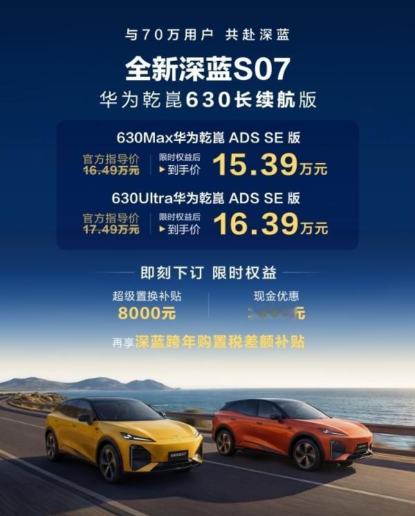 长续航+华为乾崑=能打 不用深入了解就能看出,深蓝S07华为乾崑630长续航版这次是来者不善,直接打出了630KM长续航+华为乾崑两大杀手锏。这对于一款纯电SUV来说,意义重大。 首先是630KM长续航,比原来的550KM多了将近100KM,在这个价位的纯电SUV续航中,已经排到了前列。 在实际使用中,可以更好的满足车主跨城交通的需求,毕竟从北京到上海也才1200KM,深蓝S07华为乾崑630长续航版中间只需要补满电一次,就能完成这半个中国的行程了。