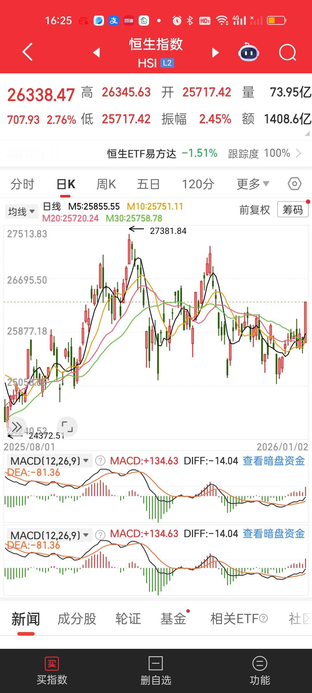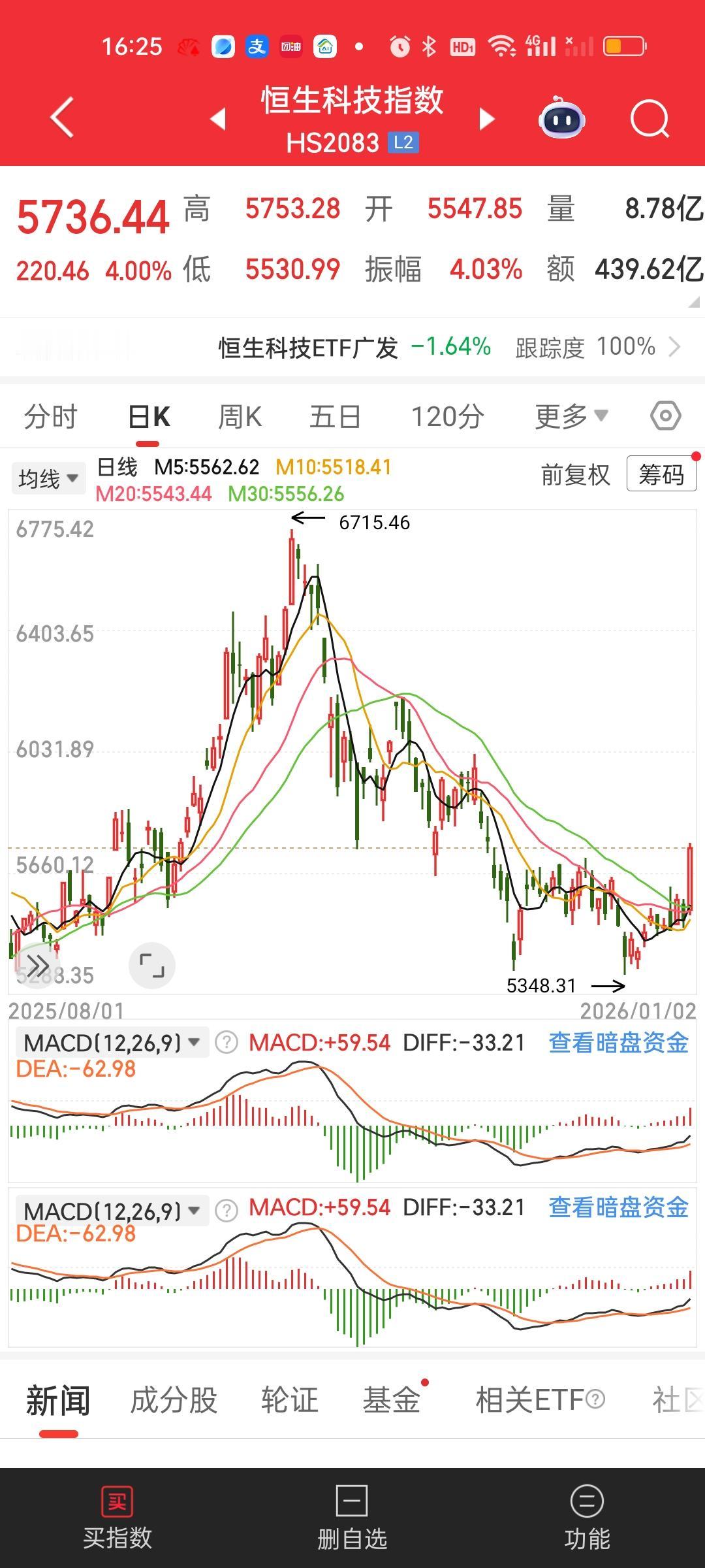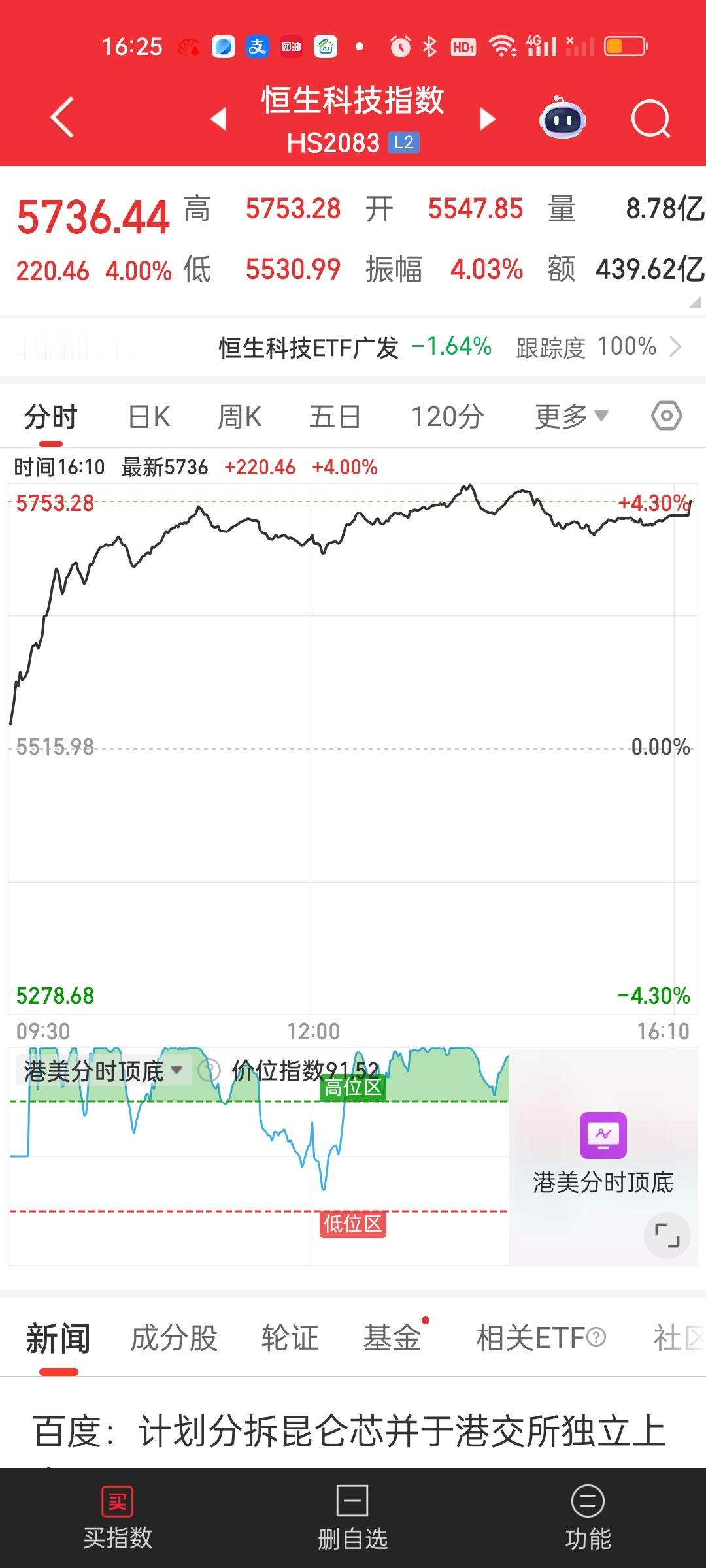 港股今天收盘了,依旧维持了全天强势的表现,尾盘并没有跳水。恒指和恒科全都稳稳站在了所有均线的上方。当然了已经持有恒指和恒科的,今天不管是场内还是场外的基金都是有收益的。 但这个收益是累加的,假如下周一收盘恒指跌3.76%,恒科跌5.5%,那么就减掉今天的涨幅2.76%和4%,恒指场外的会开跌1%,恒科场外的会开跌1.5%。所以现在还不能高兴的太早。万一下周一来一根阴包阳就啥都没有了! 至于场内ETF怎么开,比如恒指今天涨了2.76%,如果低开1.76%,那恒指ETF依旧会高开1%,如果高开2%,那恒指就会高开2+2.76=4.76%,总之不管高开还是低开,开盘就会算上今天的涨幅。 场外的是按照收盘的指数算的。这就是区别!比如恒科今天收盘涨了4%,下周一收盘跌5%,那场外基金晚上开出来的净值就是跌1%。场外按照收盘算,场内开盘就会把今天的涨跌幅折算进去。