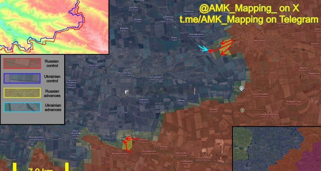 奥梅尔尼克方向,俄军在胡利亚波尔失守后继续推进,并在两个不同区域取得了新的进展。 在东北方向,俄军继续沿着胡利亚波尔以西的田野推进,进入了邻近的扎利兹尼奇内镇。他们沿着从该市西部边缘延伸出的两条峡谷前进,控制了那里的林场阵地。 其他部队沿着高速公路推进,占领了两处农业建筑群和一些林带,随后突入扎利兹尼奇内镇。他们迅速占领了镇中心的火车站,但第425独立突击团“斯卡拉”发起反击,成功将其清除。战斗仍在该镇东部持续。 在西南方向,俄军在卢希夫斯克以西重启进攻行动。他们沿着通往比洛希里亚的道路推进,占据了该村东侧的房屋。其他部队从诺沃波克罗夫卡渡过康卡河,占领了比洛希里亚南部,与第一批突击部队会合,继续清除该定居点。 + ~4.95平方公里有利于俄军。 欢迎加入:北哈尔科夫和苏梅自由军团第三旅