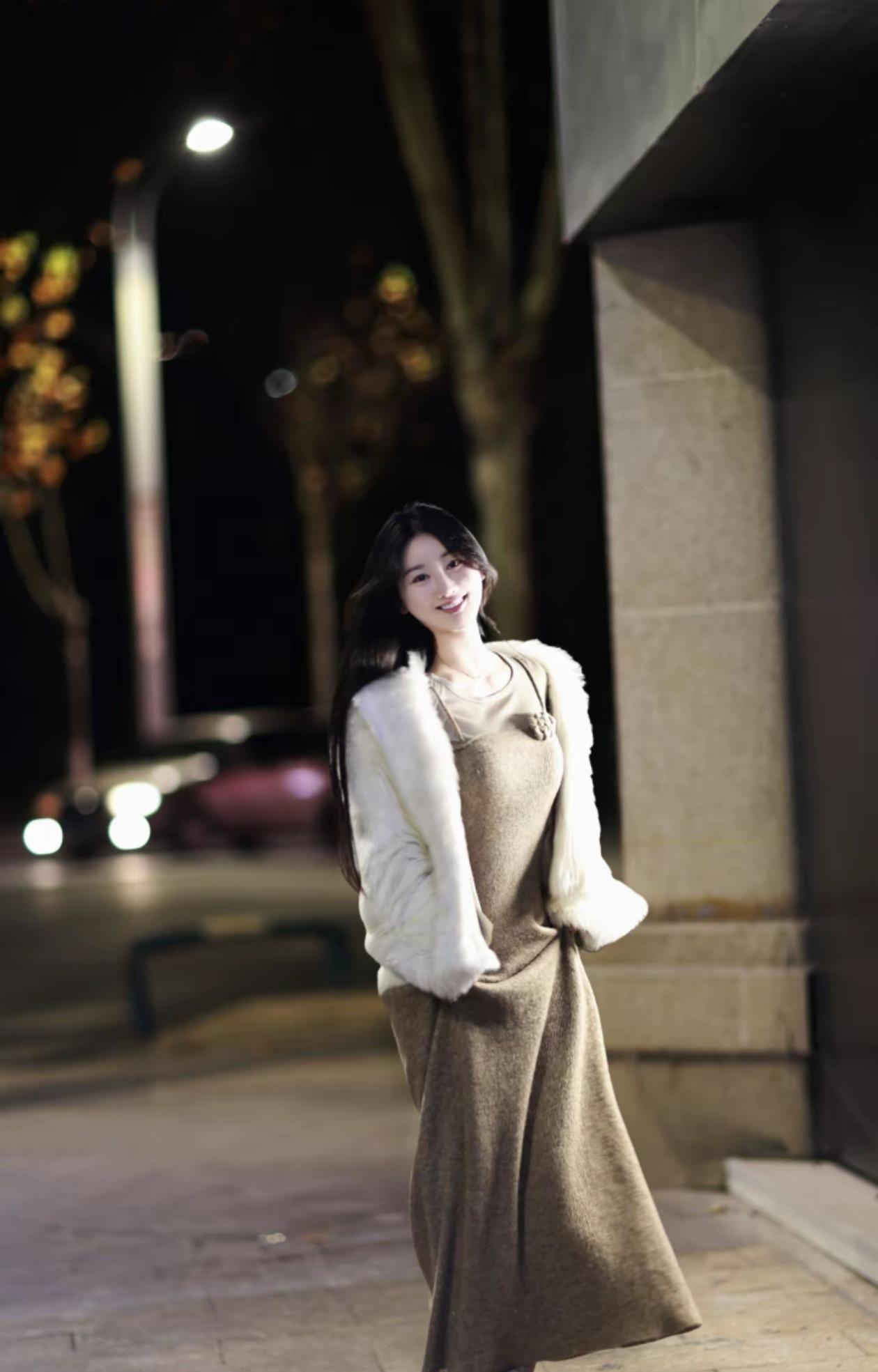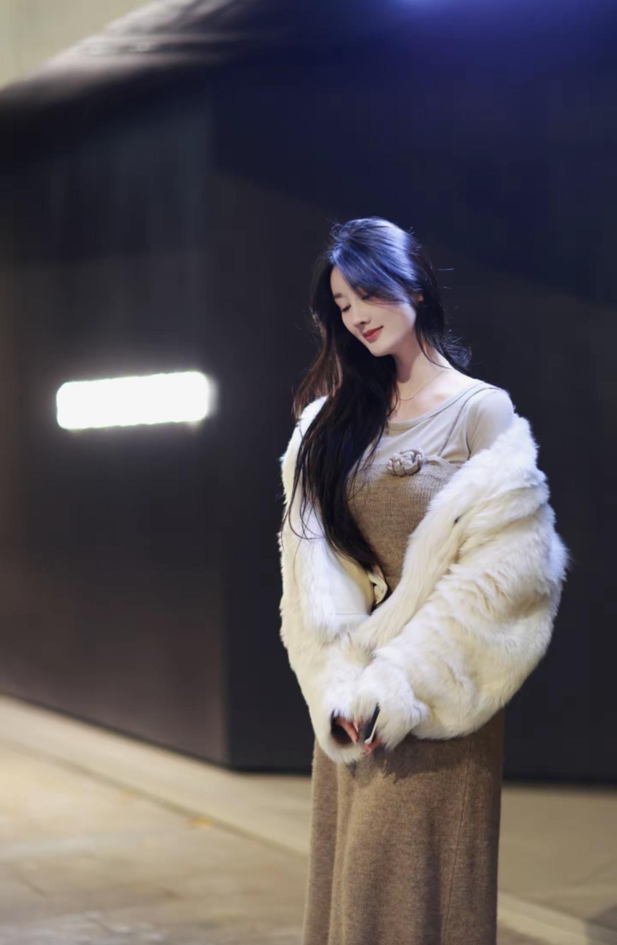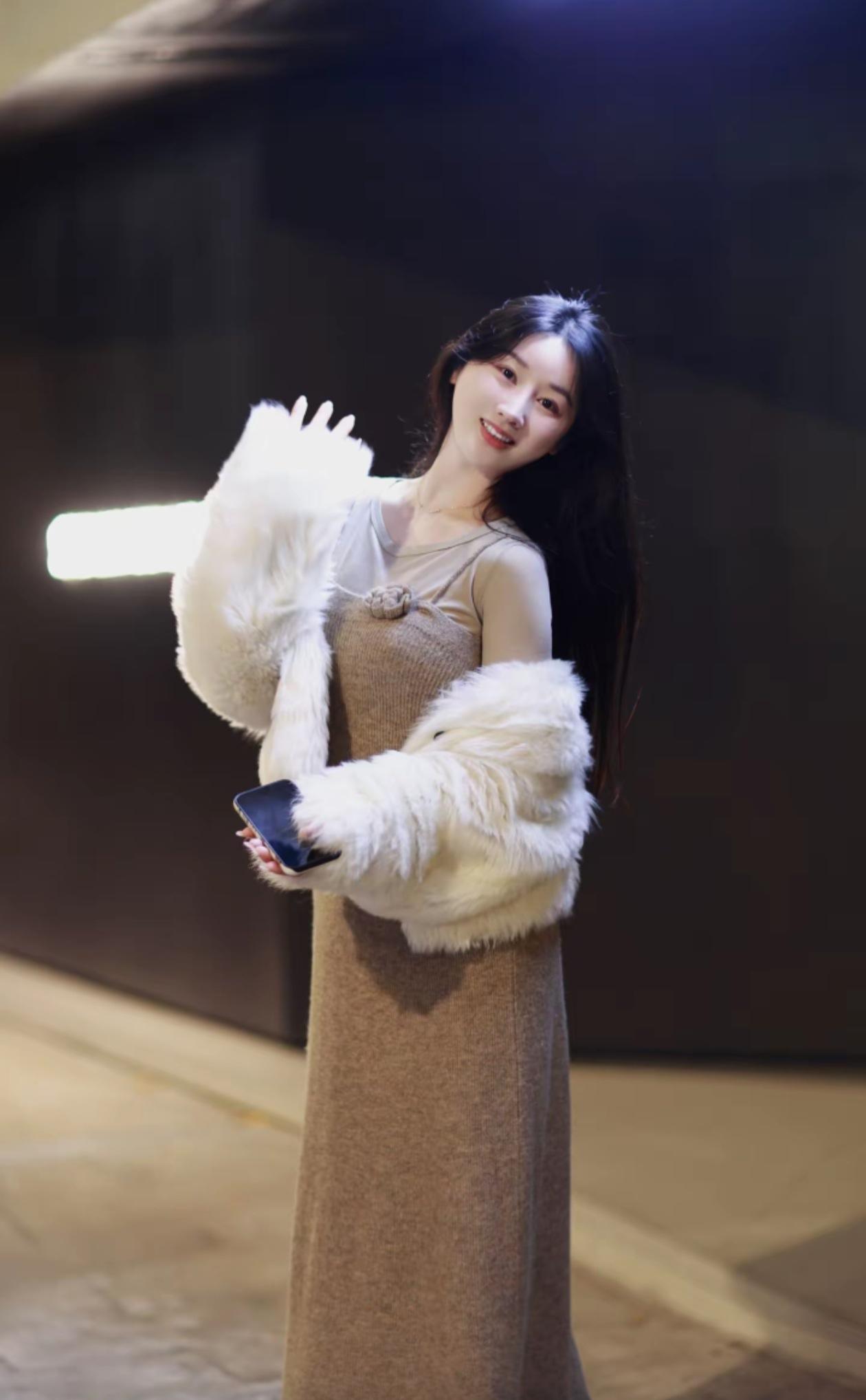 温柔甜美的冬日穿搭,毛茸茸的白色外套搭配米色连衣裙,温暖又时尚!🌟💖