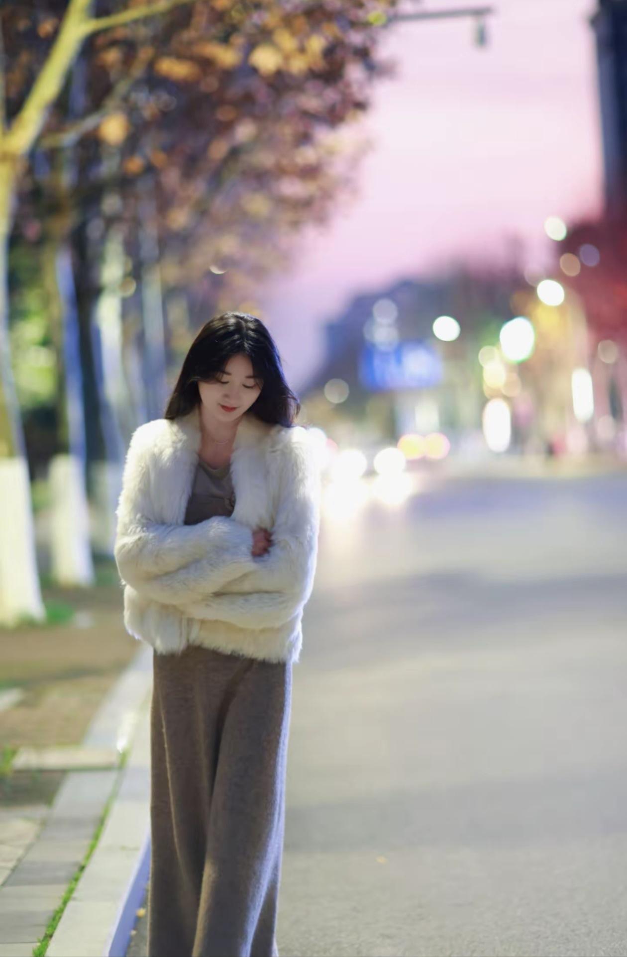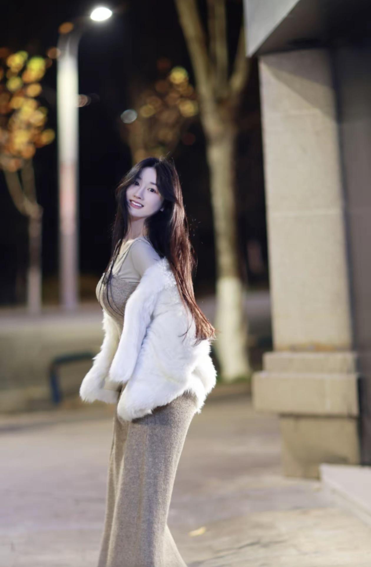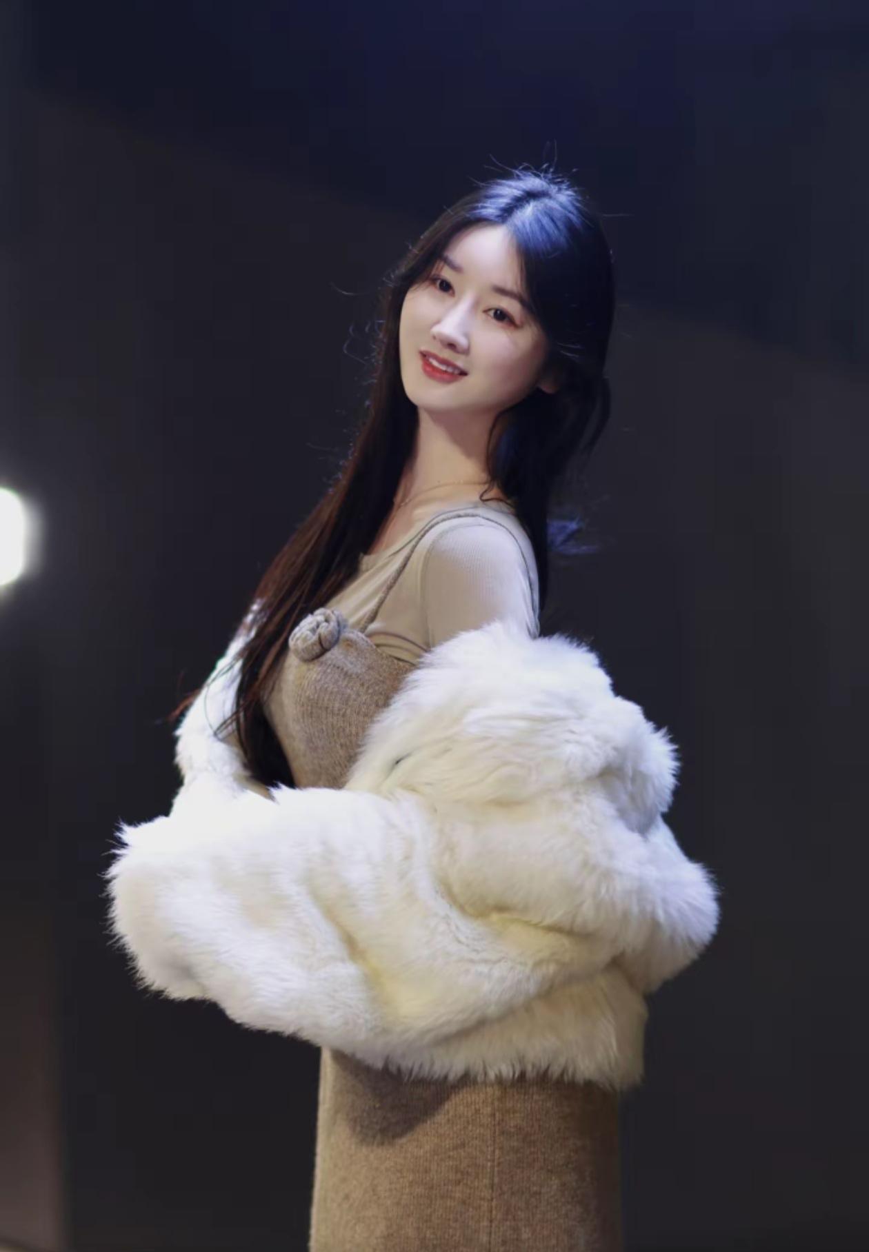 温柔甜美的冬日穿搭,毛茸茸的白色外套搭配米色连衣裙,温暖又时尚!🌟💖