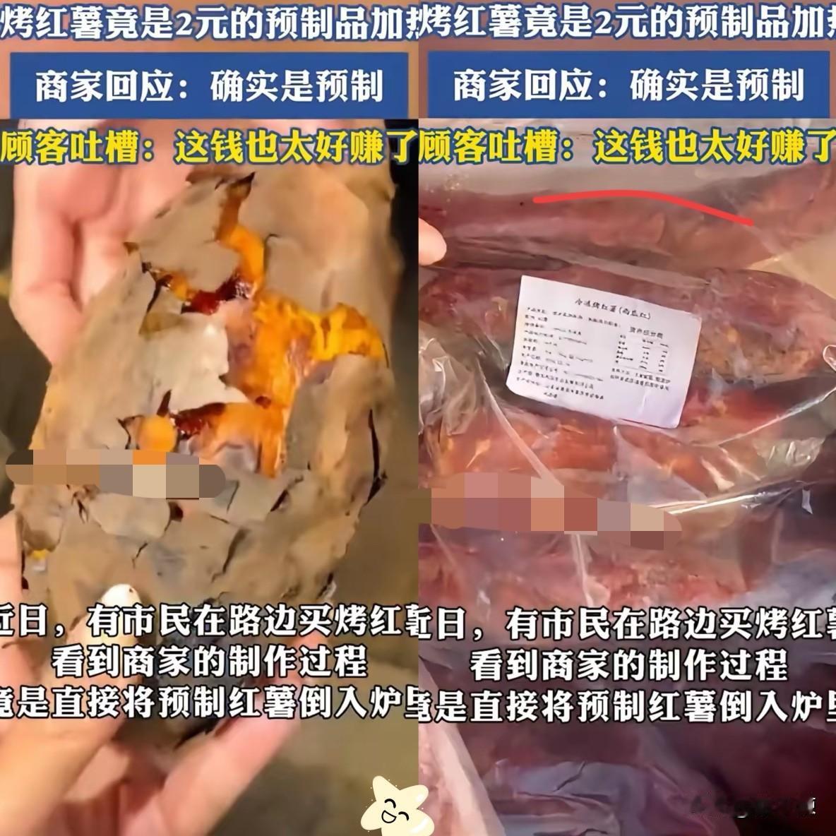 女子在街头看到有卖烤红薯的,突然心血来潮想要上去买一个,可在等待过程中,反倒撞见摊主从冷冻袋里倒半成品,2块钱的预制货,加热一下就卖8块,这钱赚得也太容易了吧! 我们馋的哪里是烤红薯那口甜糯,分明是寒风里炭火滋滋的烟火气,是红薯皮烤得焦黑、沾着点窑灰的实在感,是排队等出炉时鼻尖萦绕的香气。 预制烤红薯确实省了摊主的事,却把街头小吃的温度全烤没了。 餐饮预制化是趋势,但真没必要连烤红薯都跟风。消费者愿意为情怀买单,可不是为“加热即售”的溢价买单。 真正的美味,从来都是慢火烤出来的诚意,不是流水线走出来的套路。 你能接受预制烤红薯吗?还是宁愿多等会儿,啃一口带烟火气的现烤红薯?