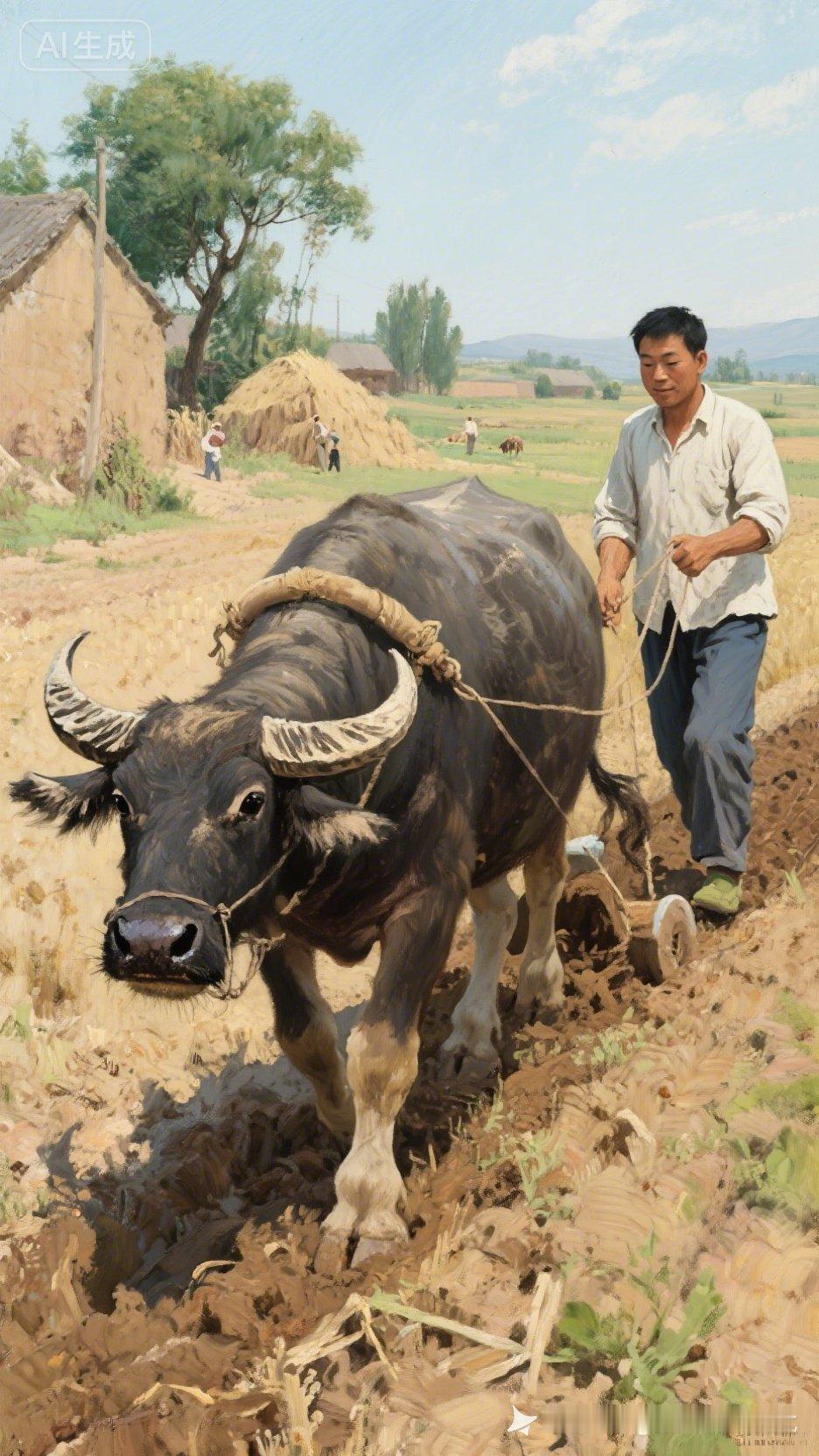 牛犁田,人耕作,乡村的宁静与美好。