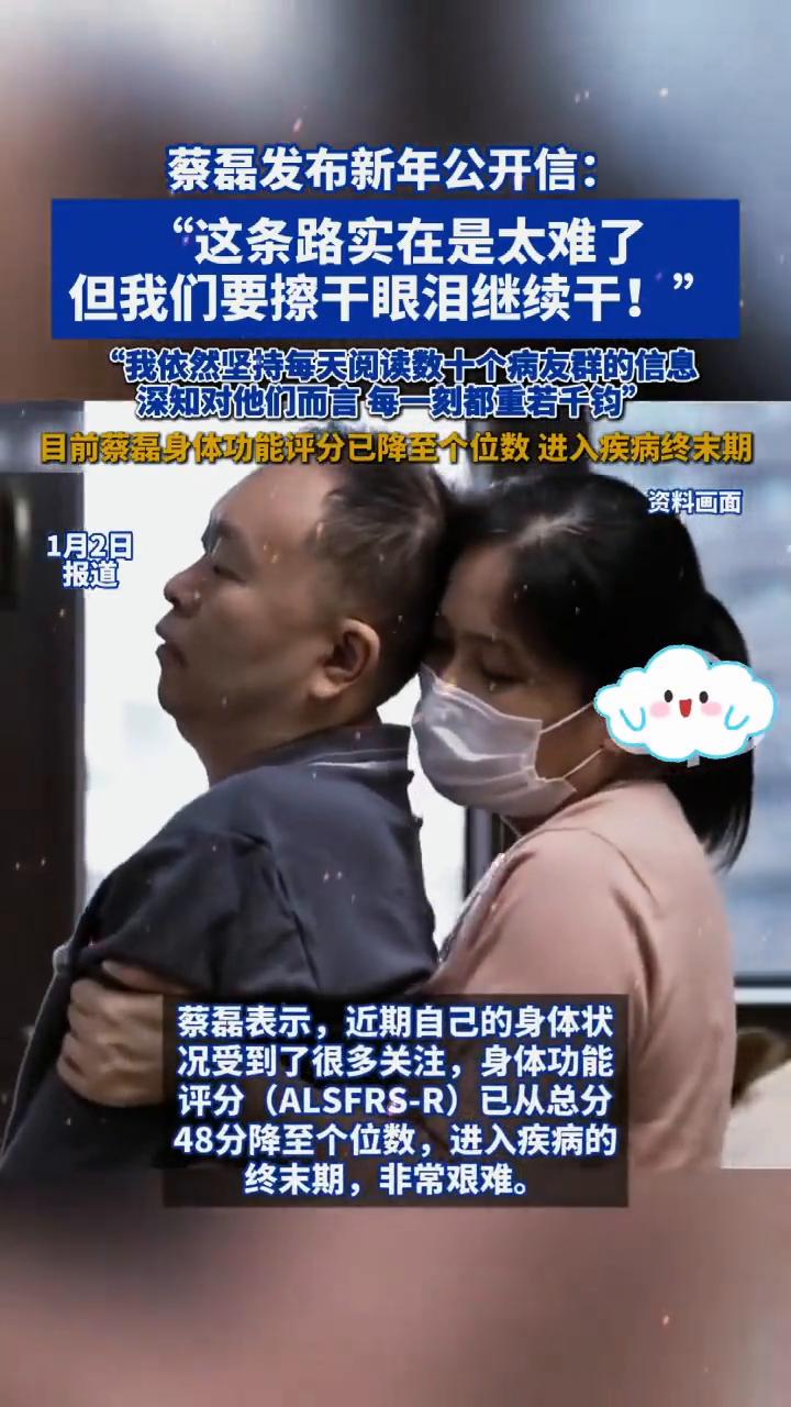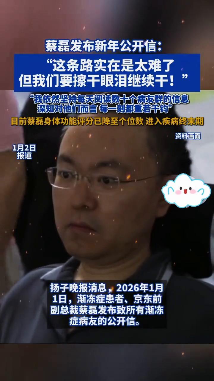 蔡磊发布新年公开信:"这条路实在是太难了,但我们要擦干眼泪继续干!" 扬子晚报消息,2026年1月1日,渐冻症患者、京东前副总裁蔡磊发布致所有渐冻症病友的公开信。 蔡磊表示,近期自己的身体状况受到了很多关注,身体功能评分(ALSFRS-R)已从总分48分降至个位数,进入疾病的终末期,非常艰难。 蔡磊表示,目前全世界依然没有看到可以阻止病情或逆转改善的药物和办法。尽管如此,对于攻克渐冻症,他依旧充满信心和希望。 "我依然坚持每天阅读数十个病友群的信息,深知对他们而言,每一刻都重若千钧。" 蔡磊说,"这条路实在是太难了,但我们唯一能做的,就是擦干眼泪继续干!"