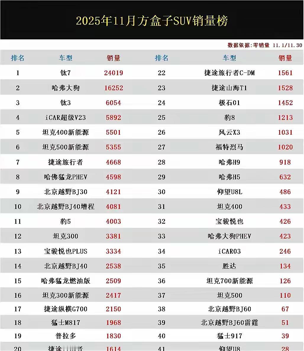 最让长城担心的事情出现了 那就是比亚迪钛七的出现迅速改写了方盒子市场的竞争格局 曾经,方盒子是长城的护城河 在这个领域长城是当之无愧的王者 但是,钛七刚刚上市就引发了消费者购买热潮,甚至一车难求 已经连续三个月成为方盒子销冠, 与之形成鲜明对比的 大狗只能退居第二 分析9、10、11三个月的销量 受影响最大的还不是大狗,而是猛龙 猛龙连续三个月销量下滑非常明显 尽管比亚迪自家的钛三和豹五也受影响 但受伤害最深的无疑是猛龙 留给猛龙的时间不多了 必须作出改变,提高配置,增大空间 否则猛龙很可能将在竞争中出局 钛7 哈弗猛龙