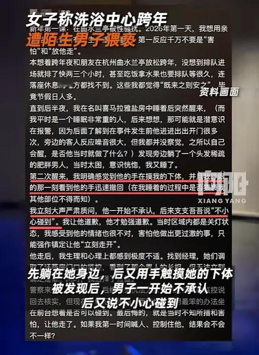 “必须严惩!”杭州一女子在洗浴中心跨年,睡得迷迷糊糊时,突然感觉有人在摸自己,被惊醒之后,竟然发现身旁躺了个陌生男子,在碰自己隐私部位,看到她醒了,急忙缩回了手!女子立刻大声严肃质问,他一开始不承认,后来支支吾吾说"不小心碰到"。女子还是报了警! 2026年元旦,杭州一名女子去“曲水兰亭”洗浴中心跨年,结果在盐房休息时遭了殃。她先是迷迷糊糊看到身边躺了个陌生男人,再次醒过来,发现对方在摸自己的隐私部位,男子被发现后,只说自己是不小心碰到的。 女子说当晚洗浴中心人特别多,进场、吃饭都要排好几个小时的队,盐房那边还总有人进进出出,管理特别松。她平时睡觉沉,第一次看到陌生男子时没反应过来,才让对方有了后续的不当行为。 女子当时就让男子道歉,对方虽然说了对不起,但态度特别敷衍。之后她找洗浴中心经理要监控,想查清楚情况,结果对方就说不清楚这事,压根没想着主动解决问题。 这事明显能看出来洗浴中心的安全管理有大问题。作为休闲场所,盐房这种休息的地方,居然能让陌生人随便进,既没有好好管控人员,也没做好安保巡逻,消费者的安全根本没保障。 那名男子的行为绝对不是什么“不小心”,就是故意的性骚扰,想拿一句随口的借口蒙混过关。这种行为要是不严肃处理,只会让更多人敢在公共场合乱来,女性的安全也更没谱。 女子选择报警的做法特别对。现实里很多被性骚扰的人,要么觉得丢人要么害怕,就忍了下来,反而让坏人逍遥法外。遇到这种事,及时报警、留好证据,才是保护自己的正确办法。 目前警方已经介入调查了,可洗浴中心还没就管理漏洞给出说法。大家不光想知道这名男子最后会被怎么罚,更希望洗浴中心能正视问题,把安全措施补好,别再发生类似的事。 公共场所的安全不能只做表面功夫,商家得把人员管理、安保巡检这些事落实好,监管部门也该多查查这类休闲场所,从根上堵住安全漏洞,这样消费者才能真的放心去消费。 你觉得洗浴中心该为这事担哪些具体责任?女性在公共休闲场所碰到这种事,该怎么第一时间保护自己?欢迎在评论区说说你的看法。