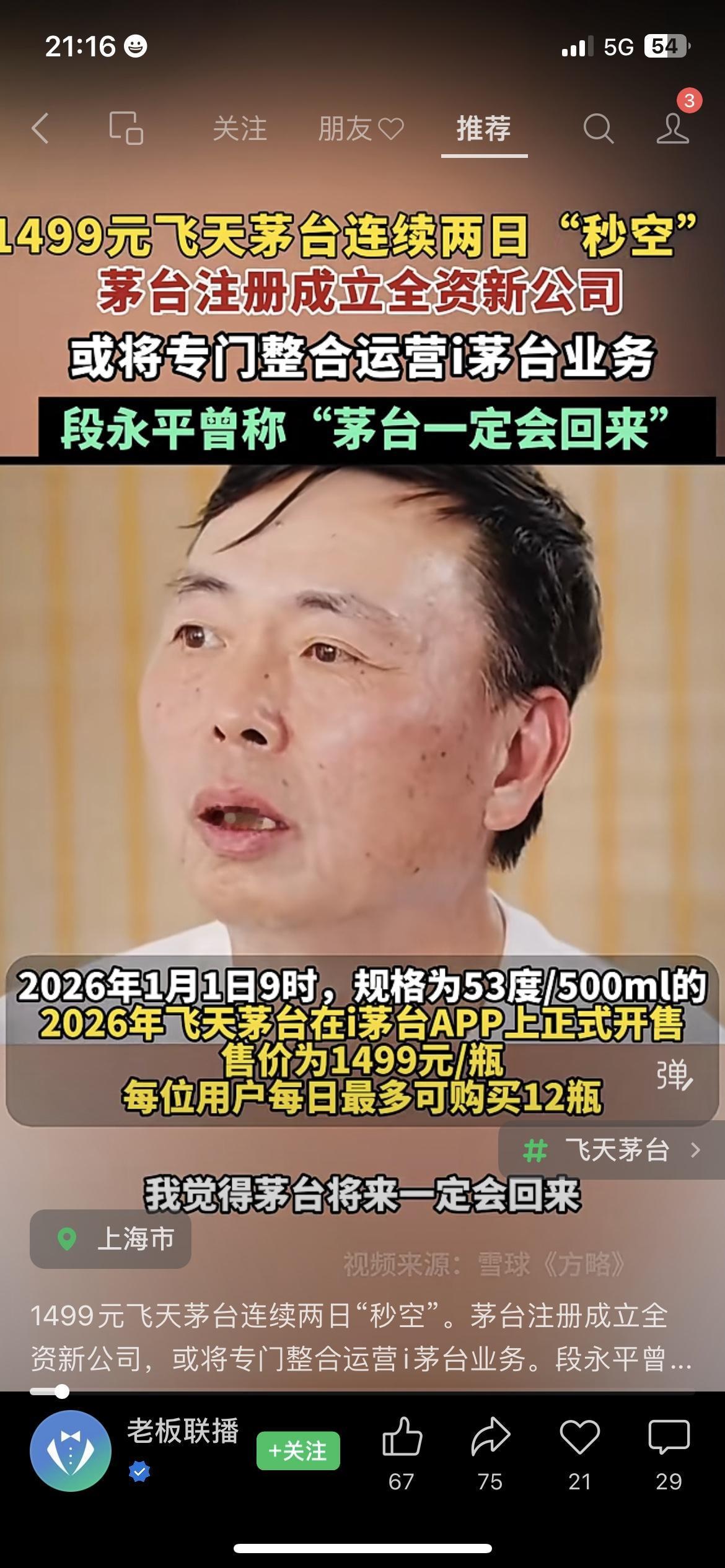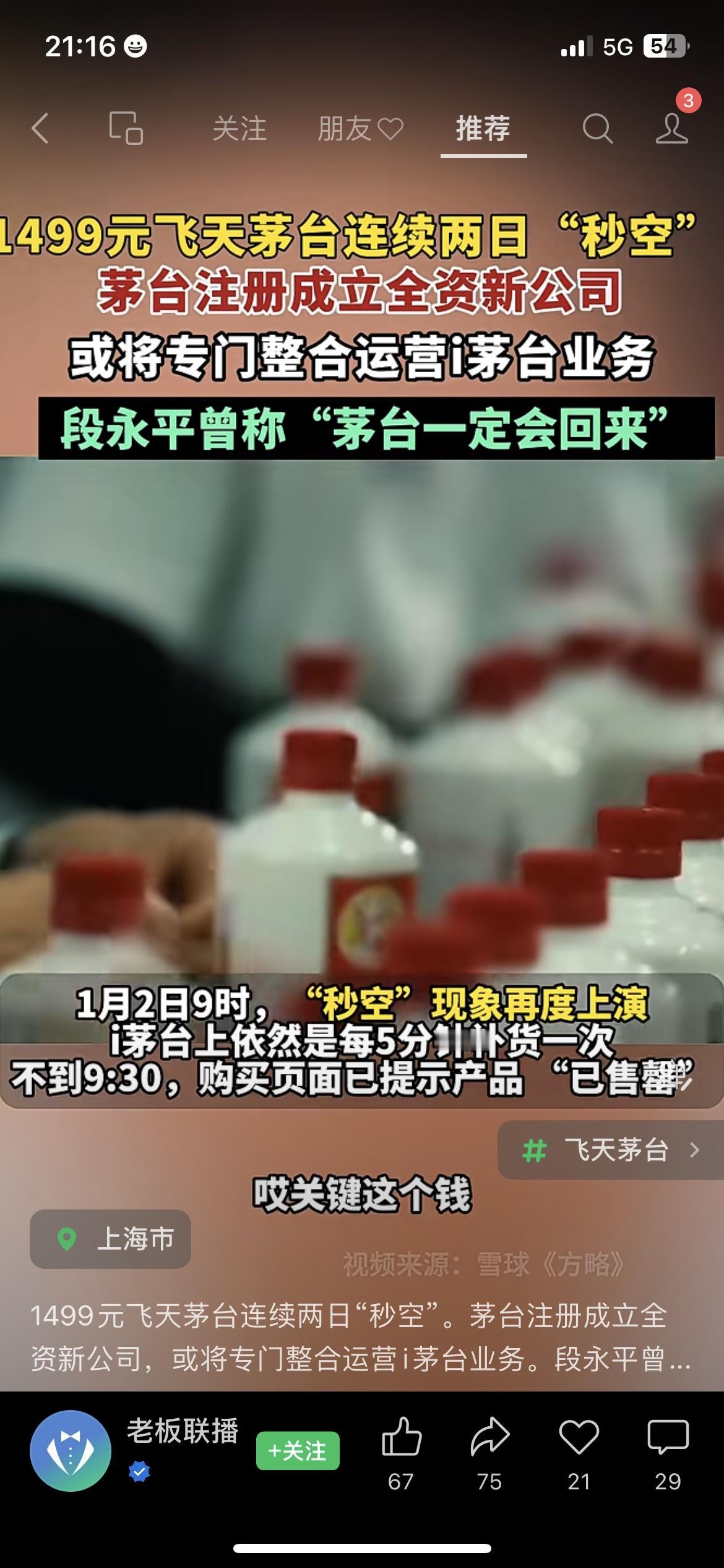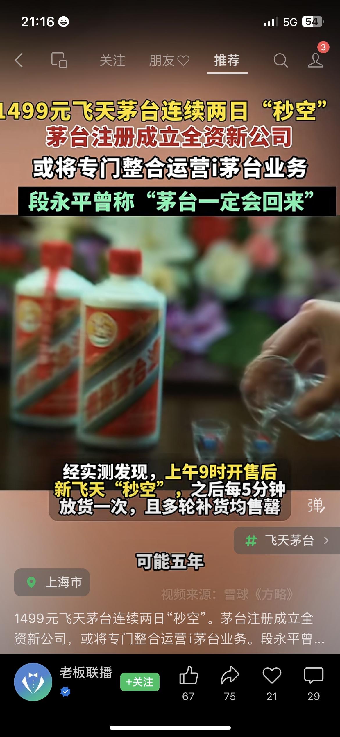 1499元飞天茅台又被抢疯了!i茅台APP连续两天一秒售空 茅台元旦当天成立新公司,砸了6个亿专门做线上业务,段永平还说“茅台肯定能回来” (茅台新公司信息来源:茅台集团官网) 楼下烟酒行王老板跟我吐槽,有人定闹钟抢茅台,手指戳屏幕都戳红了,结果啥也没抢到,跟抢春运火车票一个样 茅台这是铁了心要把线上渠道玩明白啊 你蹲过i茅台的飞天茅台吗?你觉得6亿新公司能让茅台线上抢酒变容易吗?