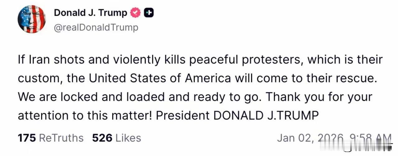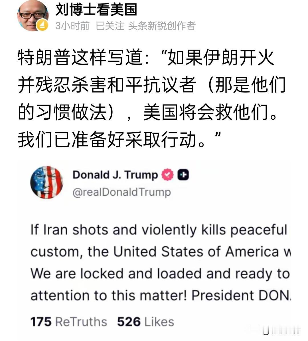 客观的说,特朗普的这段话说得确实太霸道了,是粗暴的干涉伊朗的内政,是威胁。但是不客观的说,这种表现还挺霸气,有担当,至少对那些身处险境的伊朗人来说,这是不可多得安全保障。 当然,“总统是靠不住的”,何况还是一位特别善变的总统,个人的好恶总不如制度的保证可靠。[笑哭]特朗普雷人言论