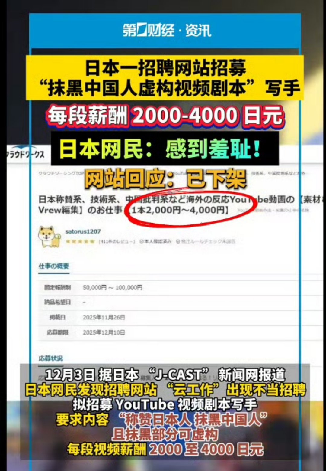 警惕日本军国主义在文体领域的渗透 “哪有什么境外势力!”资助亲日学者作家,夸日本好、骂中国视频发一条2000~4000日元。文体渗透算是日本核心技艺,主要有三部分:一,日本国内媒体整天诋毁摸黑中国,头条新闻多是中国和中国人的负面新闻,让普通日本民众保持对中国和中国人的厌恶,激发他们对中国的仇视;二,国际上靠外务省撒币行为收买一些政客、媒体和组织。这种行为已被媒体屡屡曝光,但因为日本是西方媒体(甚至国内部分)的大金主,所以基本没啥声响。三,中国国内则是靠邀请访问旅游、付费写文章,甚至金元攻势媒体人和自媒体的方式,比如日本主动抛出的过期名单,再比如光报间谍董郁玉等等。