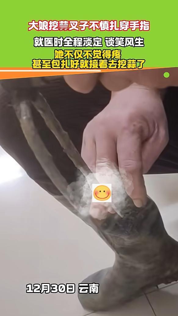 “这心态没谁了!”12月30日,云南,一大娘用叉子挖蒜时,不小心将手指扎穿,去诊