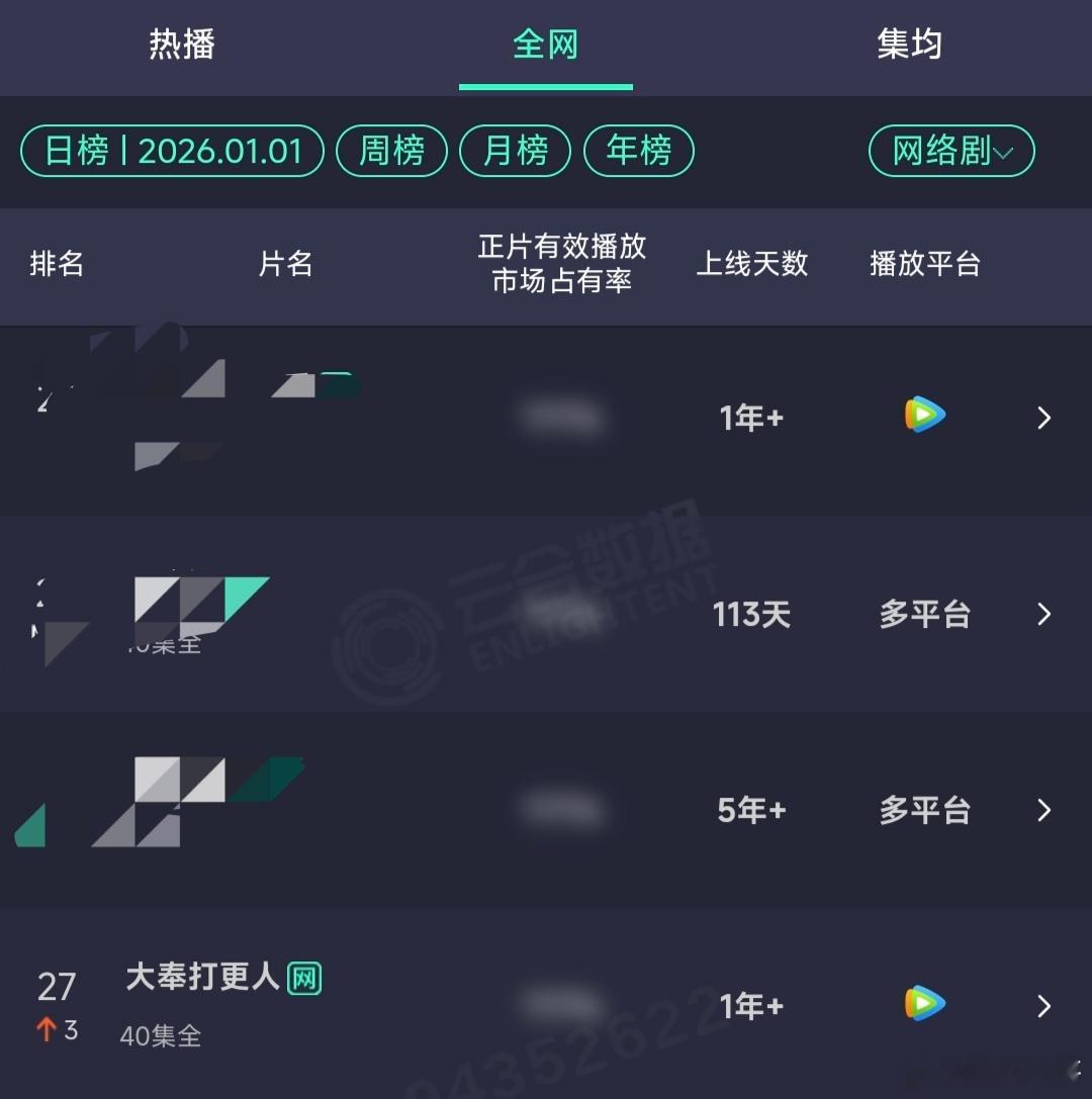 王鹤棣2024年底开播的大爆剧大奉打更人在2026年的第一天仍然登上了日播放量排行榜并且连升3个位次,且累计集均突破5530w稳占年度前五一席之地,再且拿到了2025年度台湾地区十大戏剧榜的第二名!