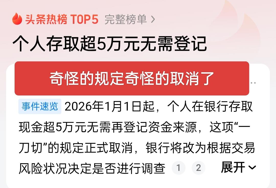 奇怪的规定奇怪的取消了,就这规定除了增加银行和储户的矛盾,增加双方的工作量,真不知道有什么现实意义?通过该规定取得过什么成绩吗?除了为难正常人,有啥用? 当年不知道哪个人想出来的,存五万完全可以规避呀,比如存五个一万,一万加四万,49999+1元,等等,那个规定形同虚设呀!只是浪费社会资源而已! 莫名其妙的取消了,证明光年的决策错了,追责吗?