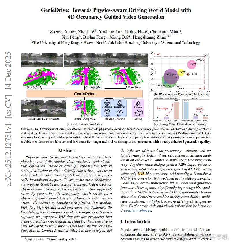 刚看到篇华为公开不久的论文,是关于一种全新的名为GenieDrive的新型自动驾驶世界模型的。原理我不可能看得太懂、大家也不爱听,最核心的点是:这个模型的车端推理的速度试验室测试结果可以达到41FPS,如果后续加以工程优化的话,大概是能优化到46~50FPS的。对比之下,特斯拉FSD的V13的推理速度是36FPS,V14的推理速度是48FPS。也就是说,华为智驾ADS的推理速度,应该很快能和FSD拉齐了。