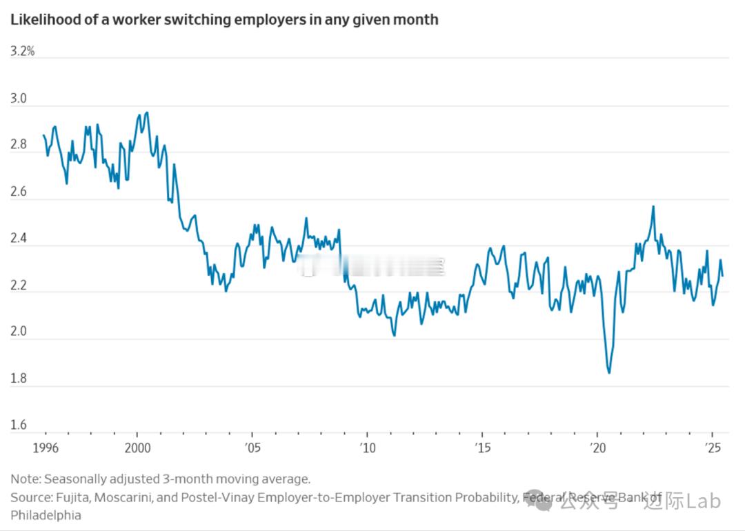 根据费城联储的数据,美国劳动力市场的流动性已长期下降,工人在任意月份更换雇主的概率从1990年代末的约2.8%降至2020年代的2.3%。劳动力流动性的停滞加剧了员工的就业不安全感:纽约联储调查显示员工再就业信心下降,而半数在职者因担心在新公司被优先裁员而放弃跳槽。Burning Glass Institute认为,招聘疲软与裁员稀少正加剧在职者(内部人)与求职者(外部人)之间的分化,并可能对毕业生的长期职业路径产生负面影响。来源:华尔街日报