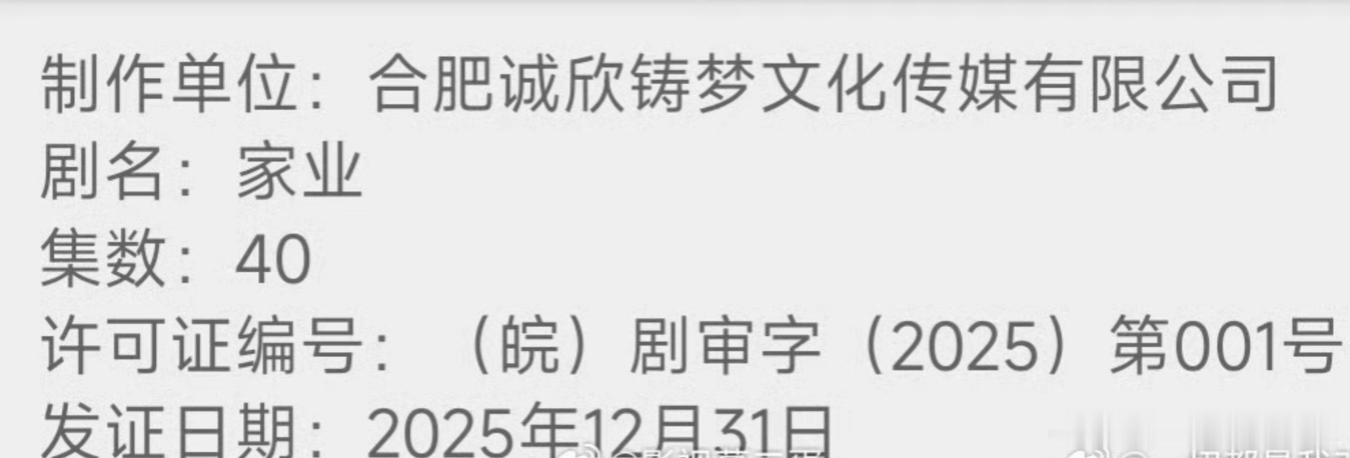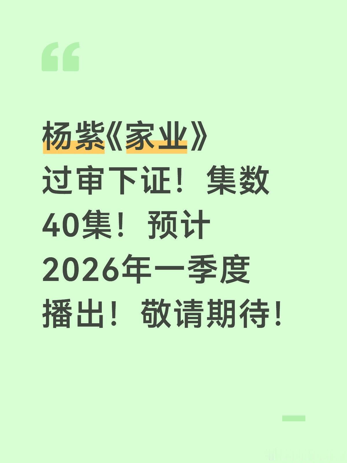 杨紫《家业》过审下证!杨紫《家业》过审下证!集数40集!预计2026年一季度播出!敬请期待!家业‖杨紫‖