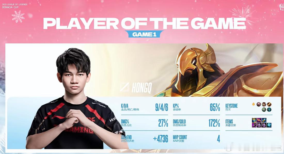 看完Faker获青龙奖,JDG和LGD德杯第一把也结束了,赢得比我想象中艰难许多,最后3C发力终结比赛,Gala韦鲁斯全场几乎没有失误,MVP给到团战压制圆神的红Q。如果今年德杯决赛是Gala对战老东家iG就太有节目效果了,虎牙不愁卖票Faker获青龙勋章Faker回应获青龙奖2025LOL德玛西亚杯