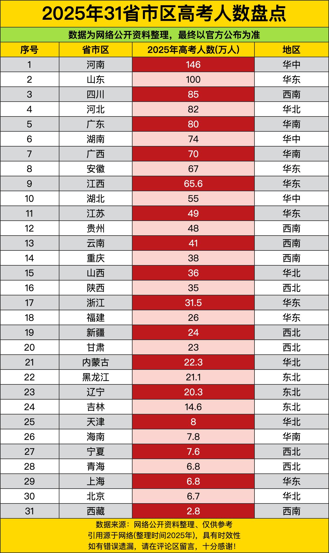 河南简直是“高考大户”本户,146万考生,这阵仗,感觉一个省的高考就能凑出一支大军了。想想那些河南的考生,那竞争压力,就跟千军万马过独木桥似的,而且这桥还特别窄,每一步都走得小心翼翼,稍不注意就可能被挤下去。 再瞧瞧山东,100万考生紧随其后。山东可一直都是教育大省,学霸辈出。这100万人里头,藏龙卧虎,竞争激烈程度也不容小觑。别的不说,就这庞大的考生基数,想从中脱颖而出,那可得付出比别人更多的努力,说不定熬红了眼、掉光了发,才能换来一张理想的大学入场券呢。 在对比一下那些高考人数相对较少的地区,像西藏只有2.8万人。人家考生数量少,竞争压力理论上就没那么大。不过这也不能掉以轻心呐,毕竟高考是选拔性考试,不管人多人少,都得拼尽全力。说不定人家这2.8万人里,个个都是“藏龙卧虎”,偷偷努力,然后惊艳所有人呢。 总体来看这全国高考人数分布,真可谓是“东边日出西边雨,道是无晴却有晴”。不同地区的考生面临着不同的挑战和机遇。但不管怎样,高考都是人生的一场重要战役,大家都在自己的战场上奋勇拼搏。希望每一位考生都能超常发挥,考上自己心仪的大学,开启人生的新篇章!