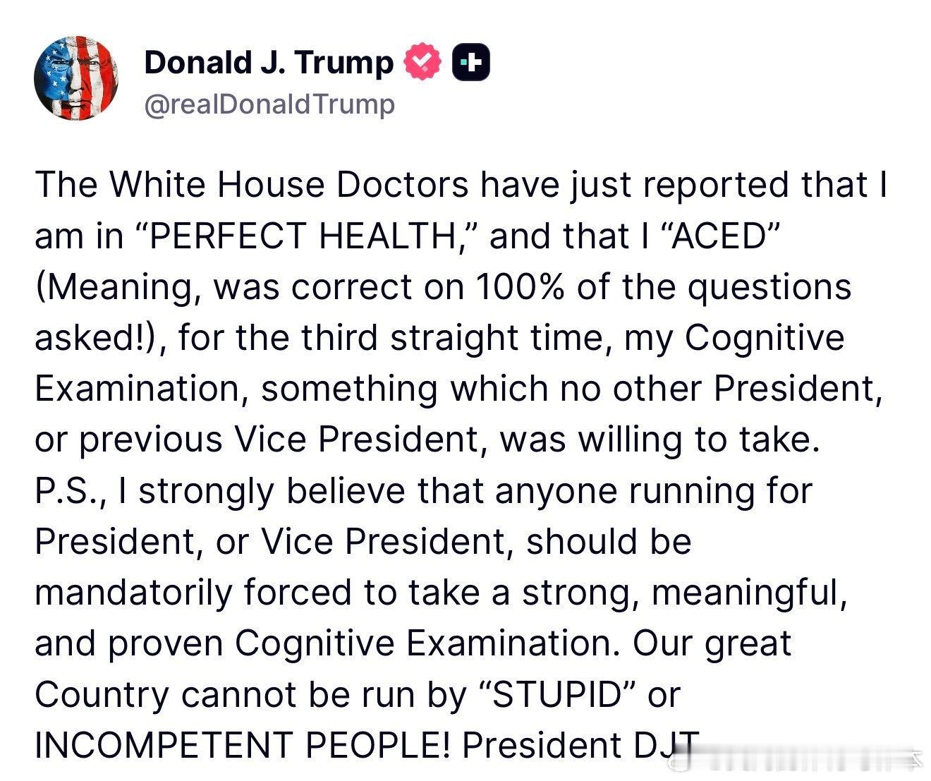 【黄金时代】川普再次报告,自己健康良好;认知测试满分通过川普:白宫医生刚刚报告称,我处于“完美健康”状态;而且我在认知测试中再次“满分通过(ACED)”(也就是说,所有问题 100% 回答正确!),这是我连续第三次通过认知检查——而这是没有任何其他总统或前副总统愿意接受的测试。附言:我坚信,任何竞选总统或副总统的人,都应该被强制要求接受一项严格的、有实际意义、并且经过验证的认知测试。我们伟大的国家,绝不能由“愚蠢”或无能的人来治理!——DJT 总统川普主义研究美国和欧洲当代史海外新鲜事热点现场